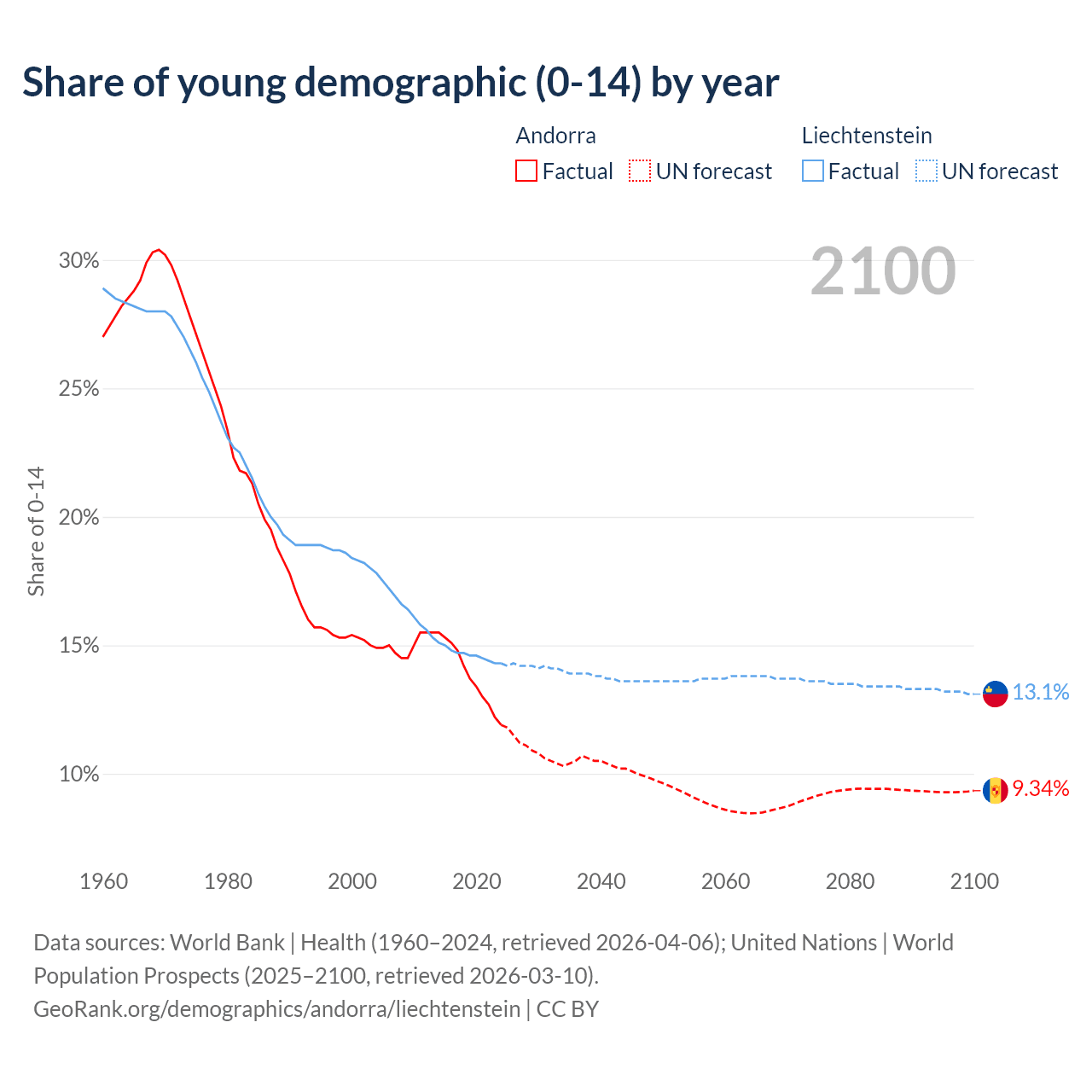 - The share of young demographic (0-15 years old) in Andorra is 11.9% vs 14.3% in Liechtenstein.