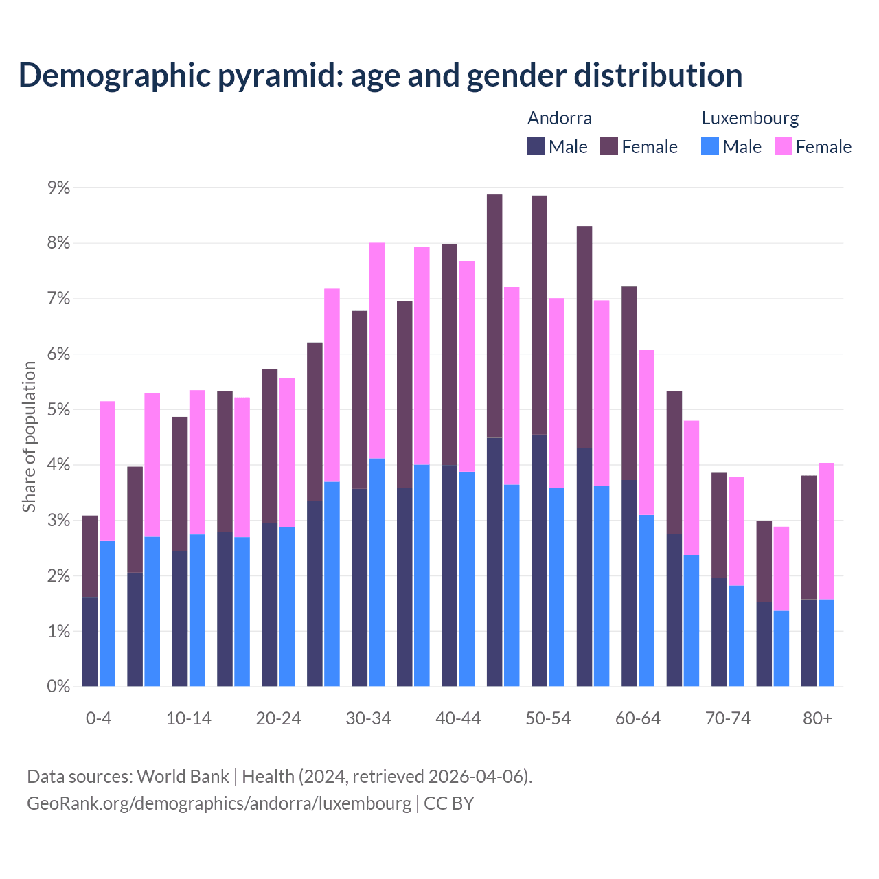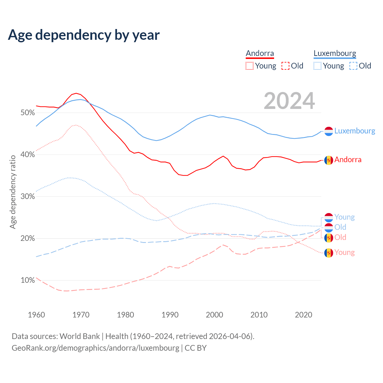 - Andorra is ranked 18/196 by median age (oldest to youngest) vs 46/196 for Luxembourg.