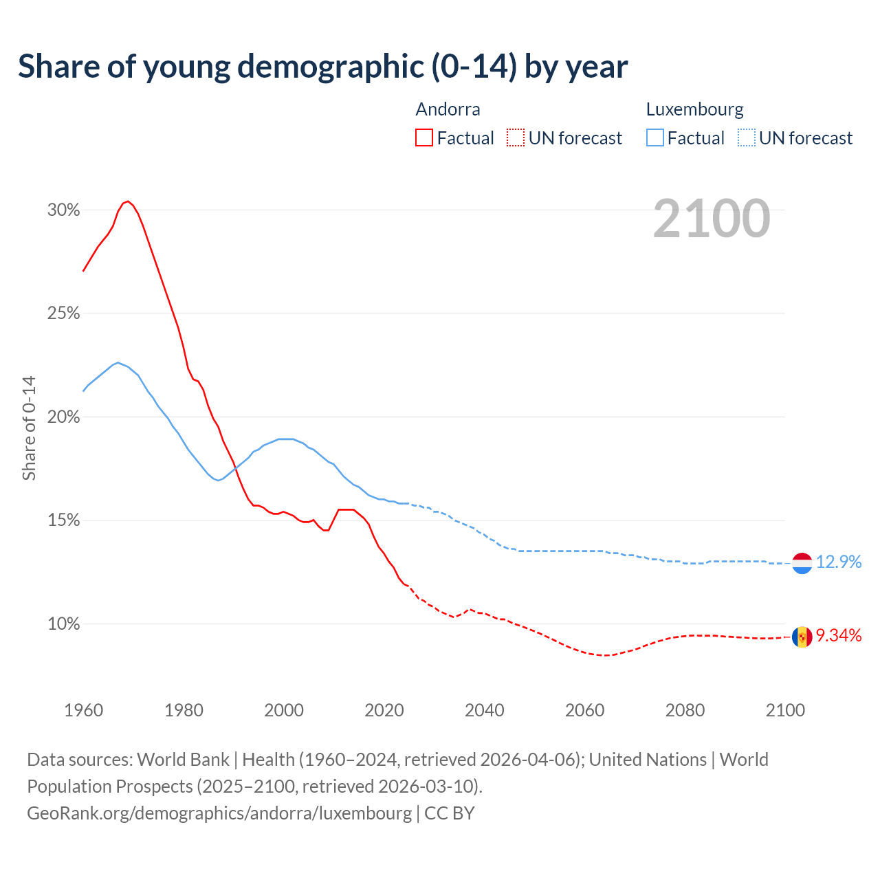 - The share of young demographic (0-15 years old) in Andorra is 11.9% vs 15.8% in Luxembourg.