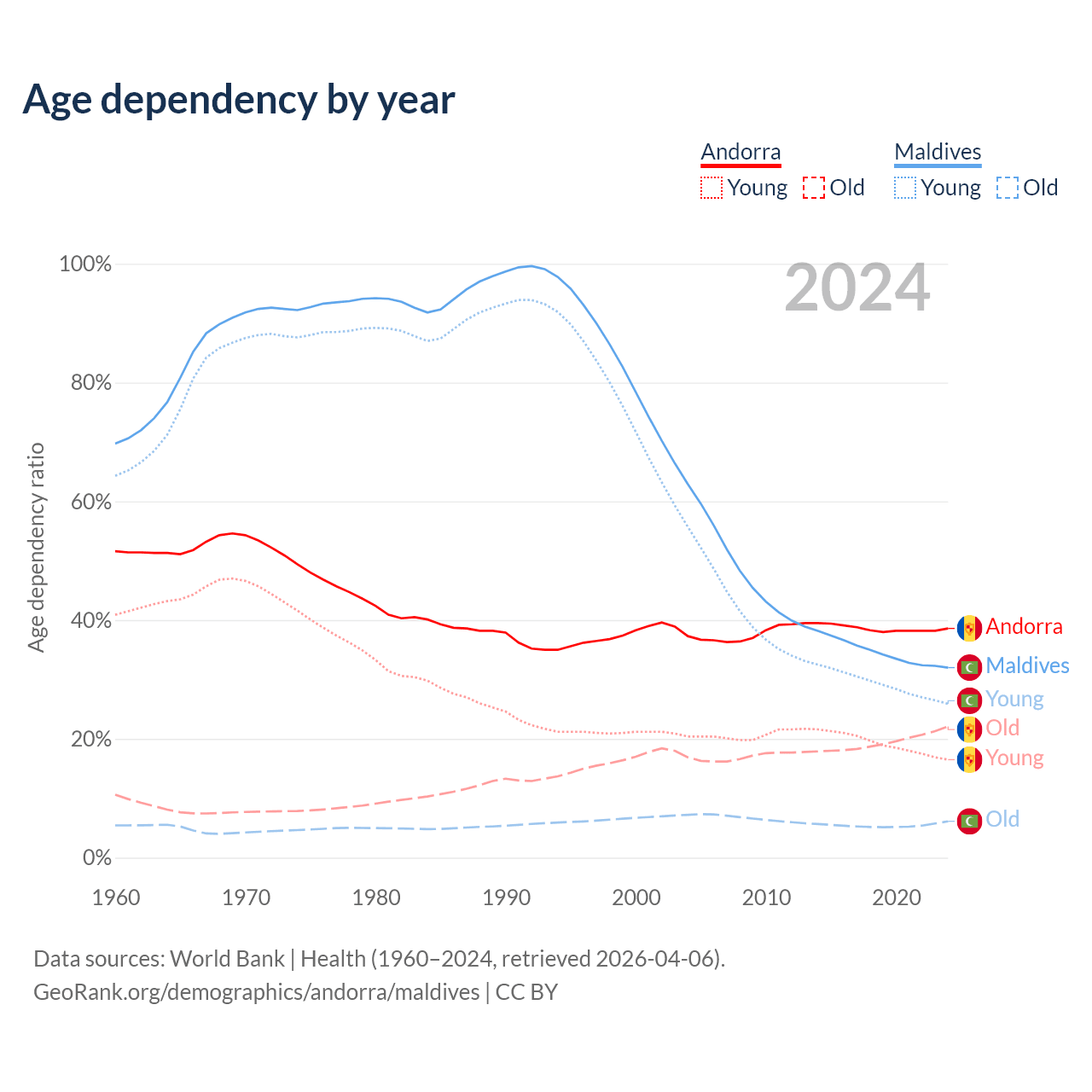 - Andorra is ranked 18/196 by median age (oldest to youngest) vs 90/196 for Maldives.