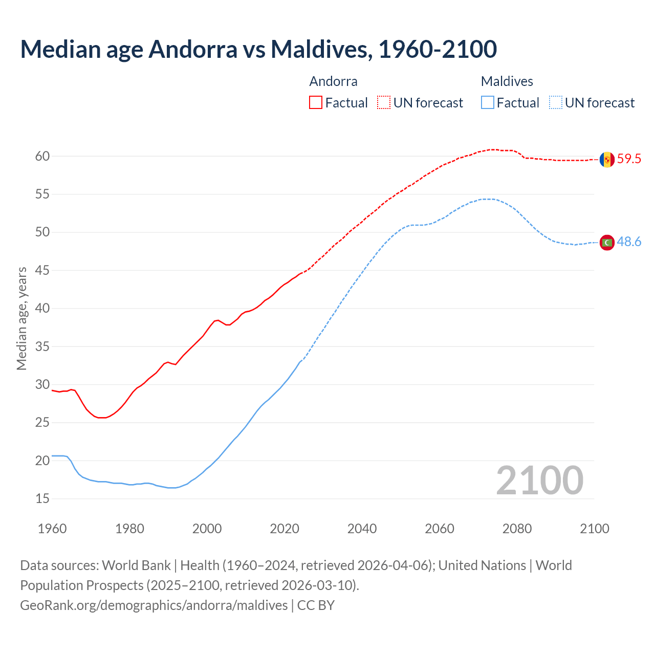 Median age Andorra vs Maldives, 1960-2100