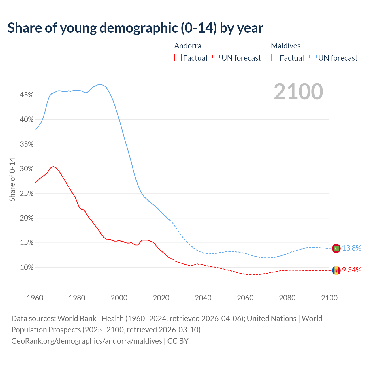 - The share of young demographic (0-15 years old) in Andorra is 11.9% vs 19.6% in Maldives.