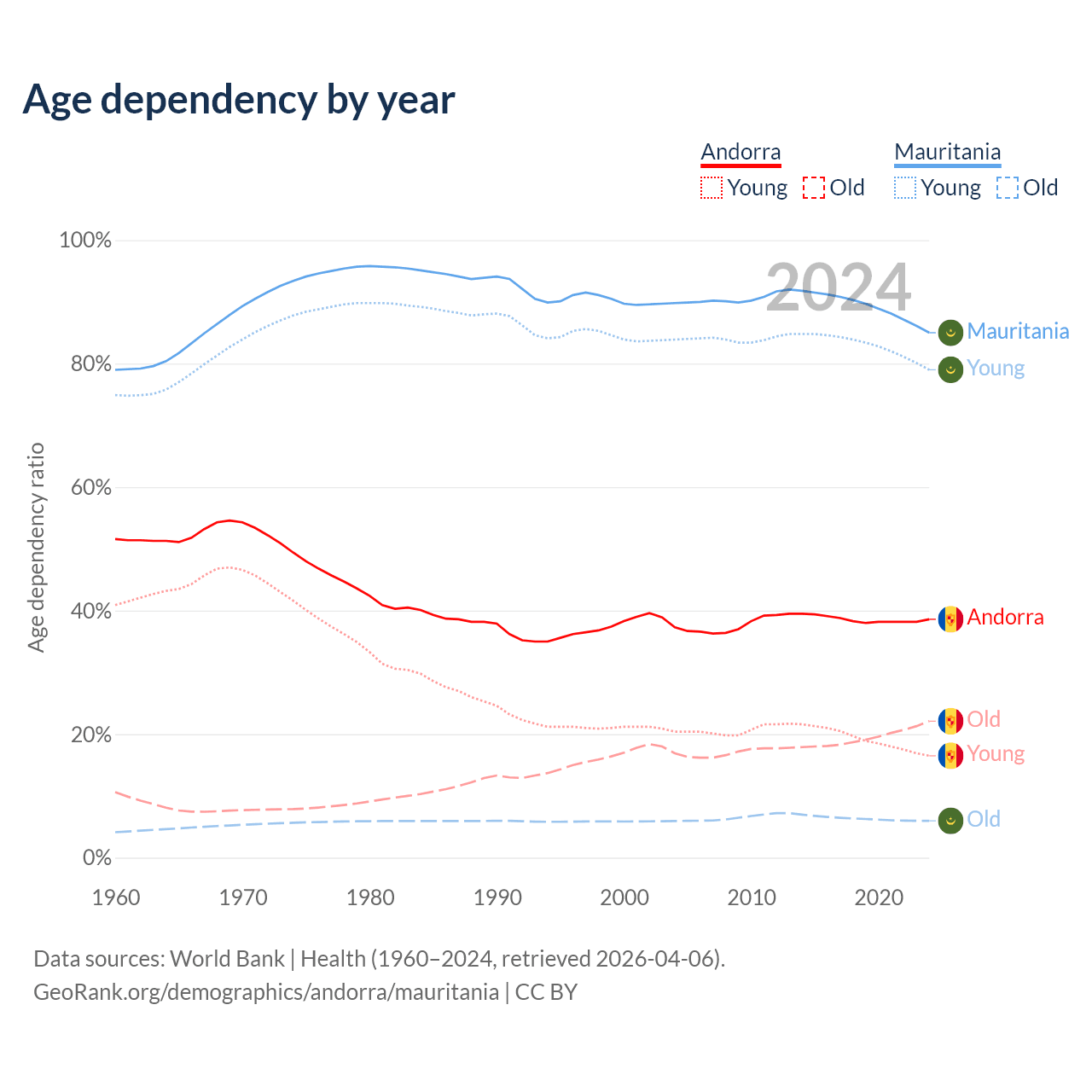 - The share of old-age demographic (65+) in Andorra is 15.9% vs 3.23% in Mauritania.