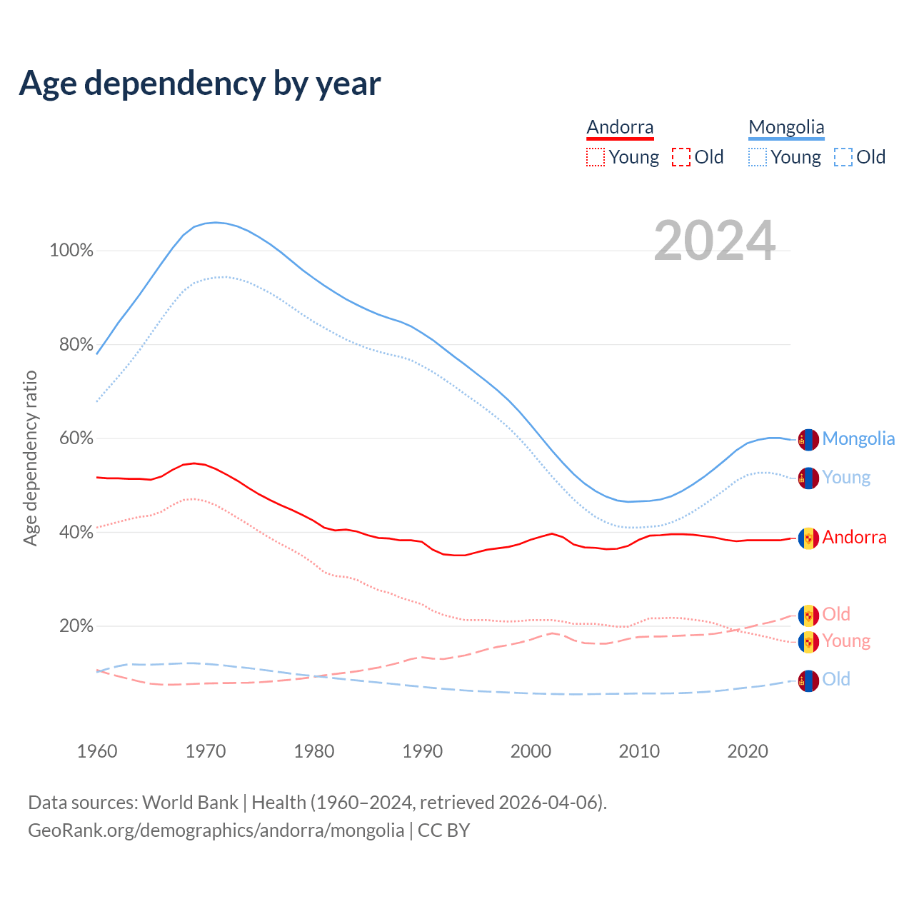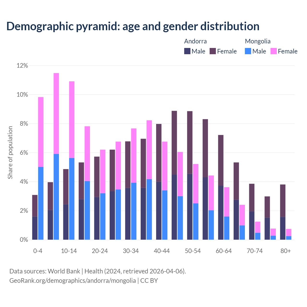 - Andorra is ranked 18/196 by median age (oldest to youngest) vs 117/196 for Mongolia.