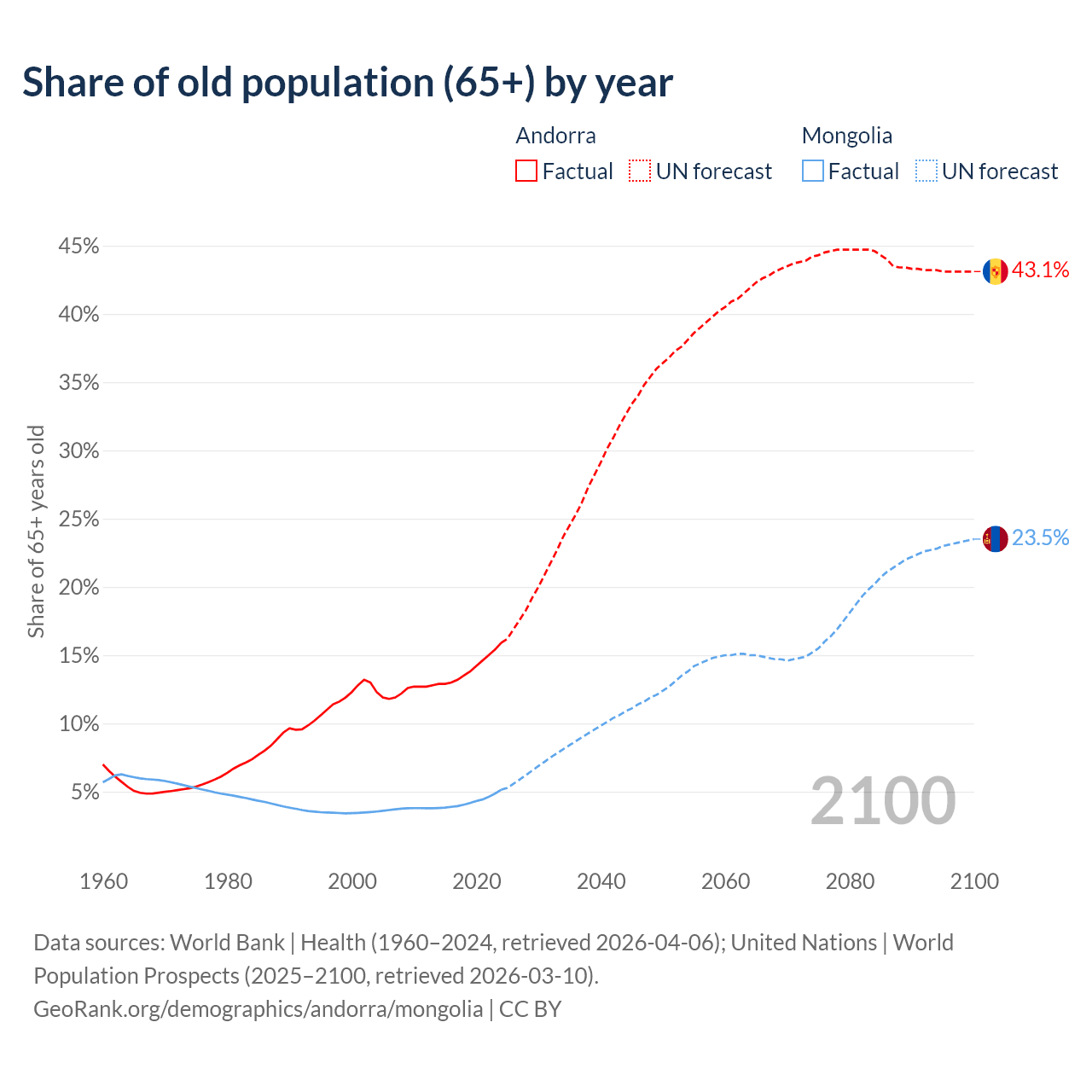 - The share of old-age demographic (65+) in Andorra is 15.9% vs 5.14% in Mongolia.