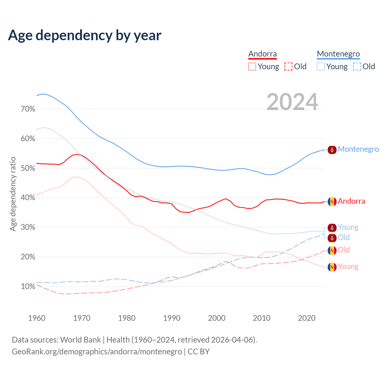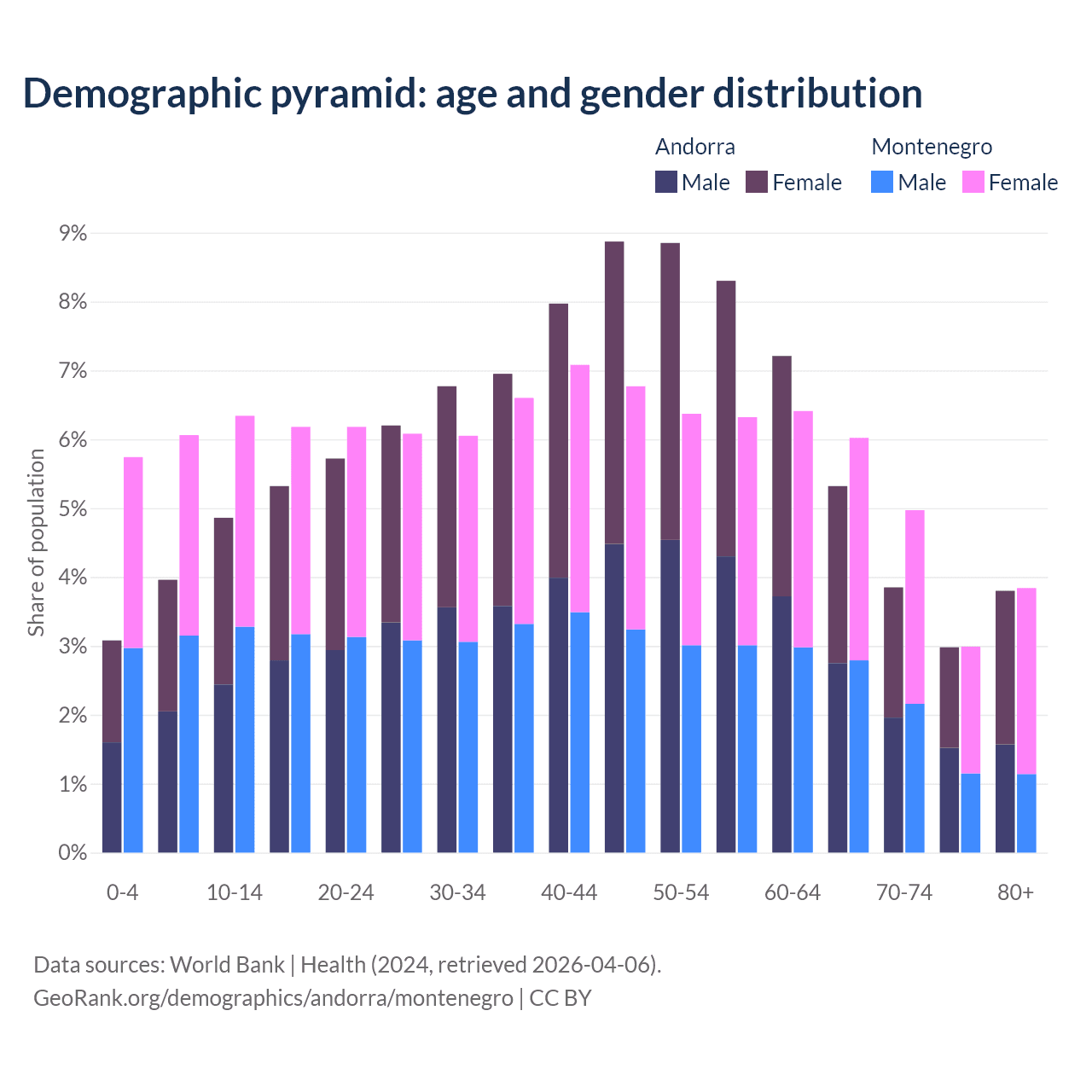 - Andorra is ranked 18/196 by median age (oldest to youngest) vs 45/196 for Montenegro.