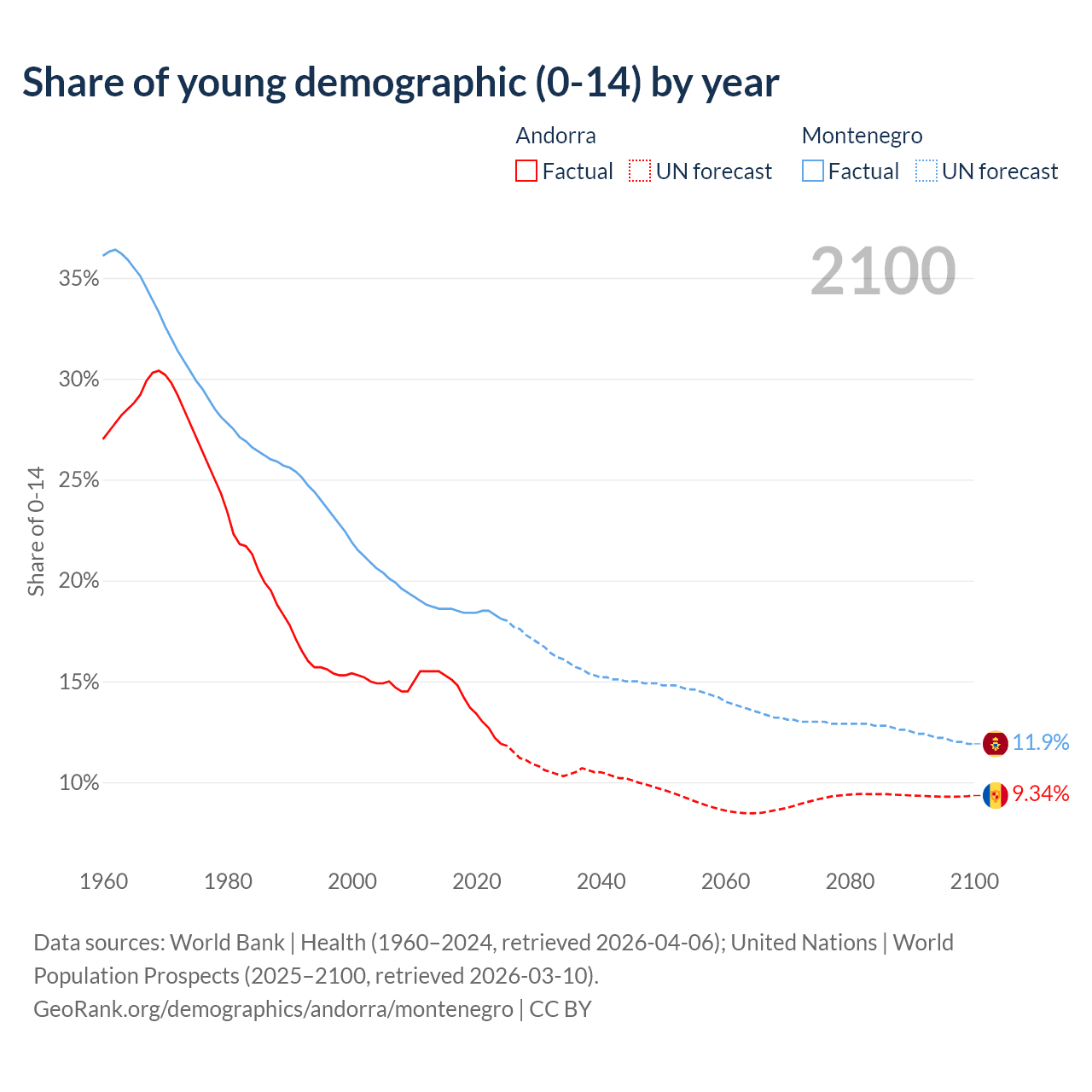 - The share of young demographic (0-15 years old) in Andorra is 11.9% vs 18.1% in Montenegro.