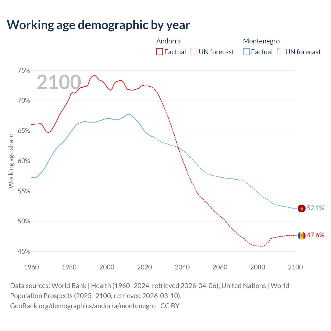 - Andorra has 60.7K working age adults (aged 15-64) vs 392K in Montenegro.