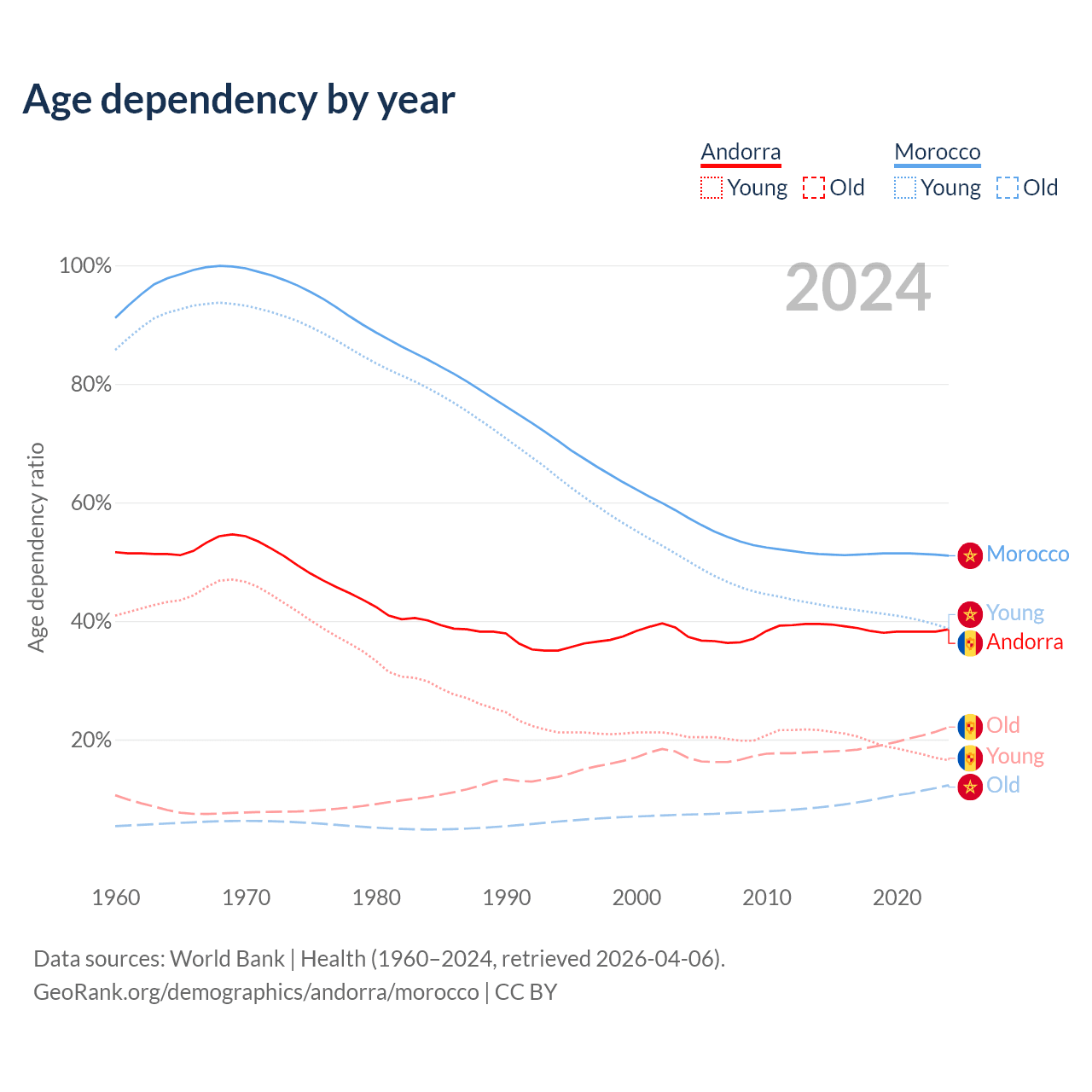 - Andorra is ranked 18/196 by median age (oldest to youngest) vs 100/196 for Morocco.