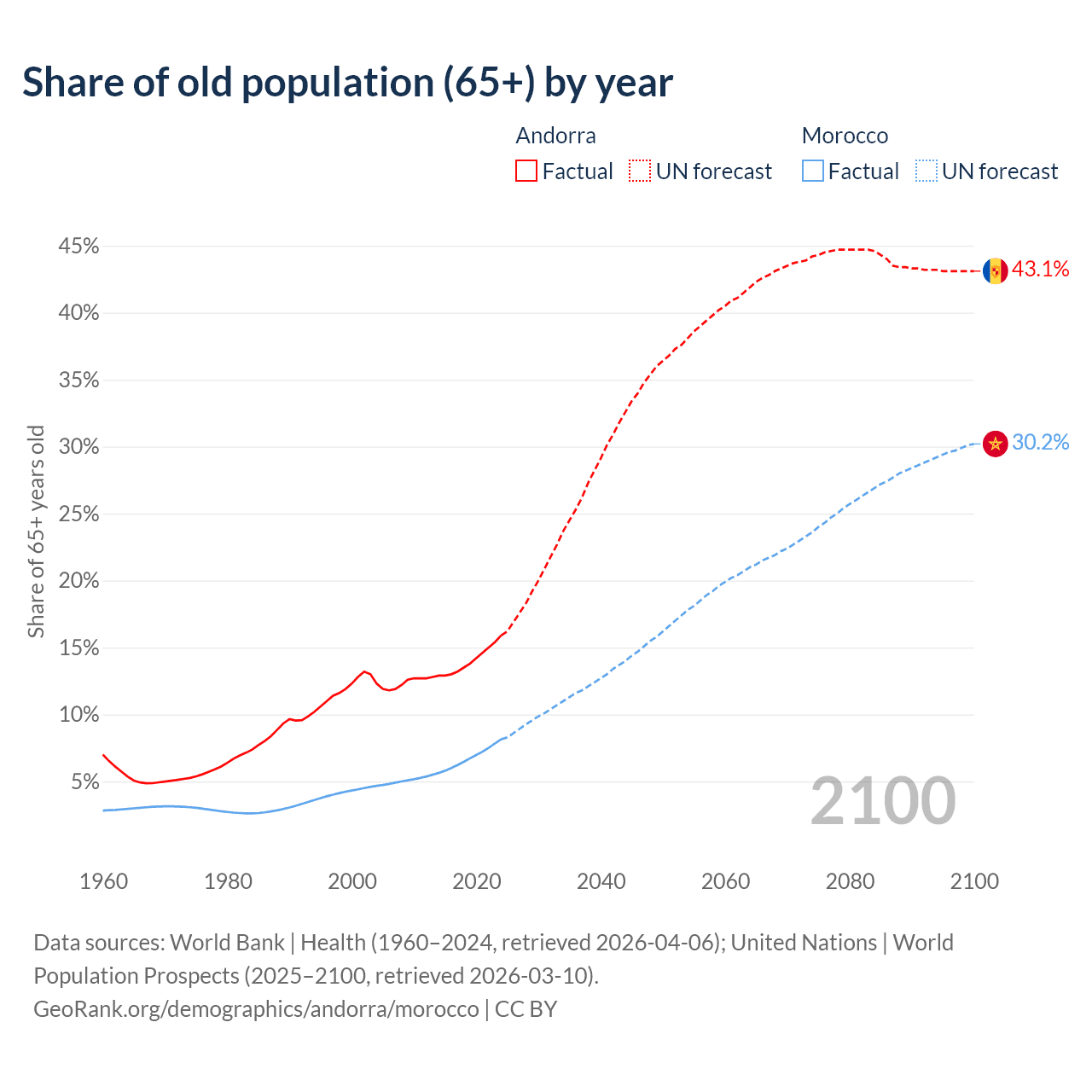 Median age Andorra vs Morocco, 1960-2100