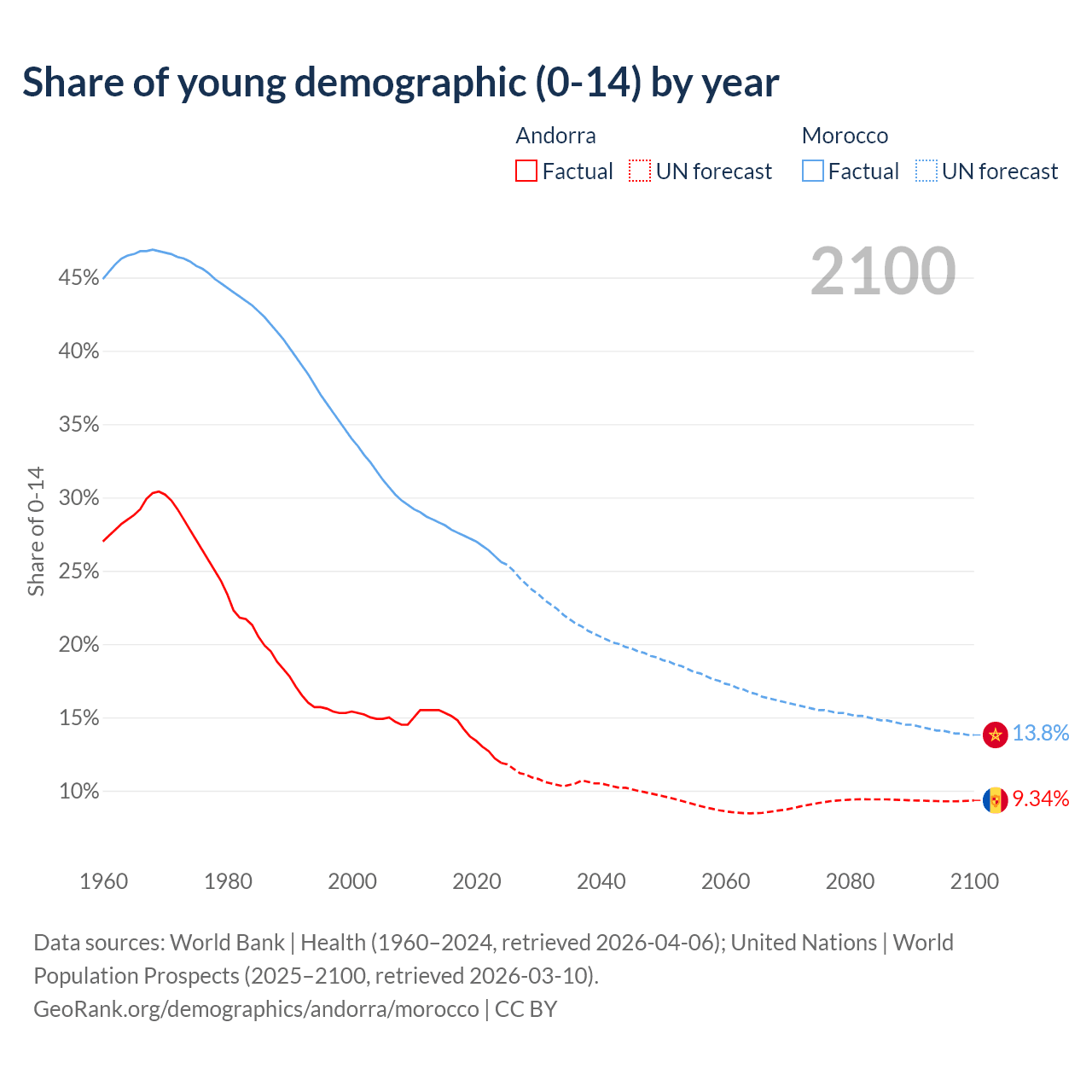 - The share of young demographic (0-15 years old) in Andorra is 11.9% vs 25.6% in Morocco.