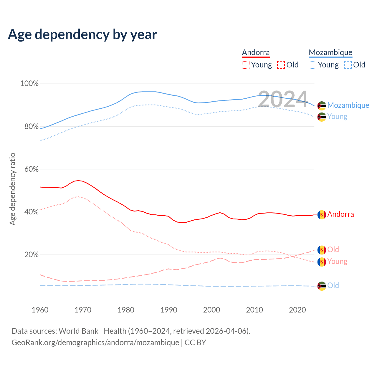 - The share of old-age demographic (65+) in Andorra is 15.9% vs 2.75% in Mozambique.