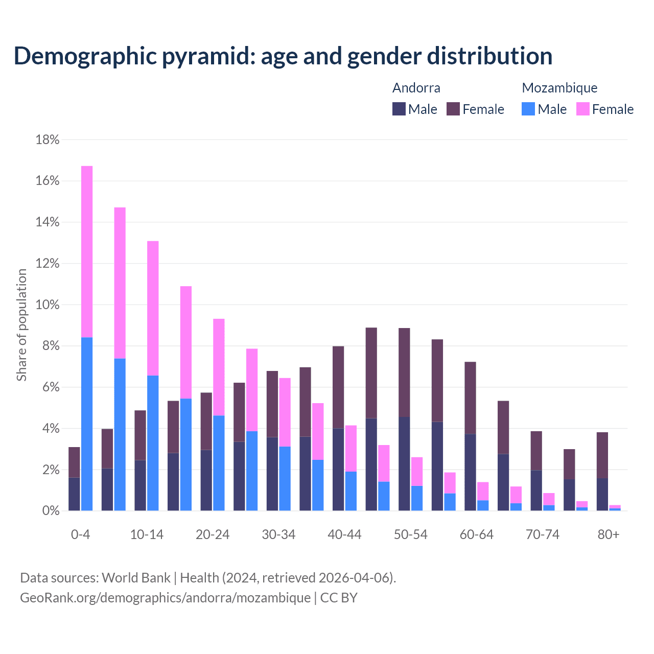 - Andorra is ranked 18/196 by median age (oldest to youngest) vs 189/196 for Mozambique.