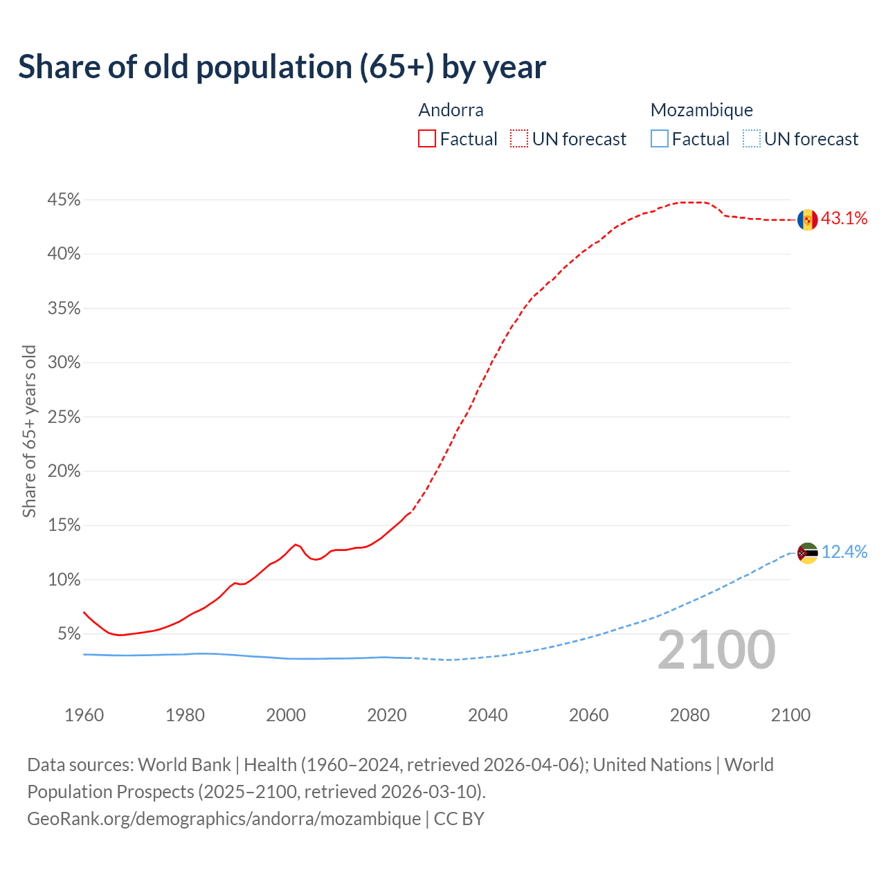 The share of older people aged 65 and over is 15.9% in Andorra and 2.75% in Mozambique. Life expectancy in Andorra compared to Mozambique .