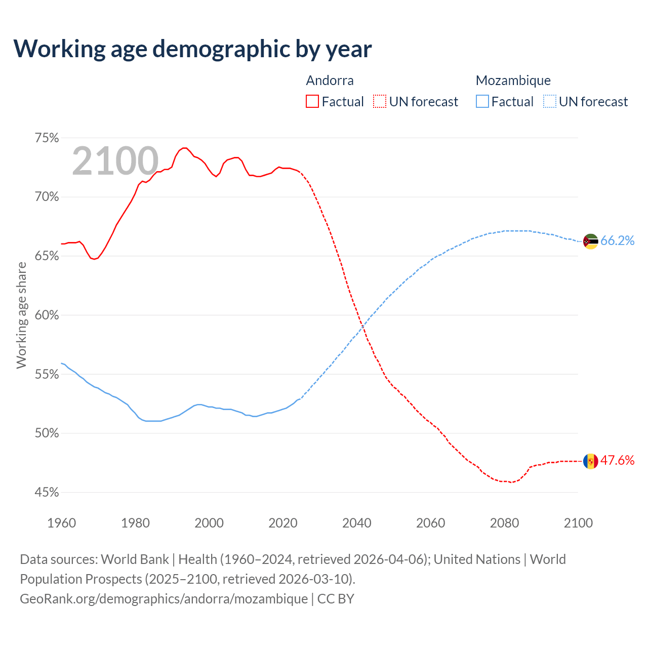 - Andorra has 60.7K working age adults (aged 15-64) vs 19.5M in Mozambique.