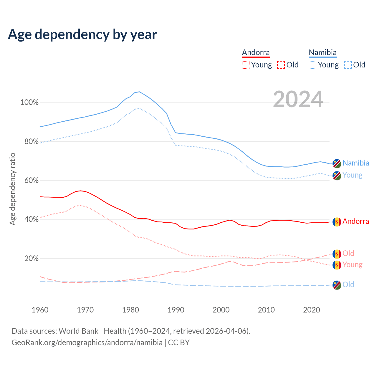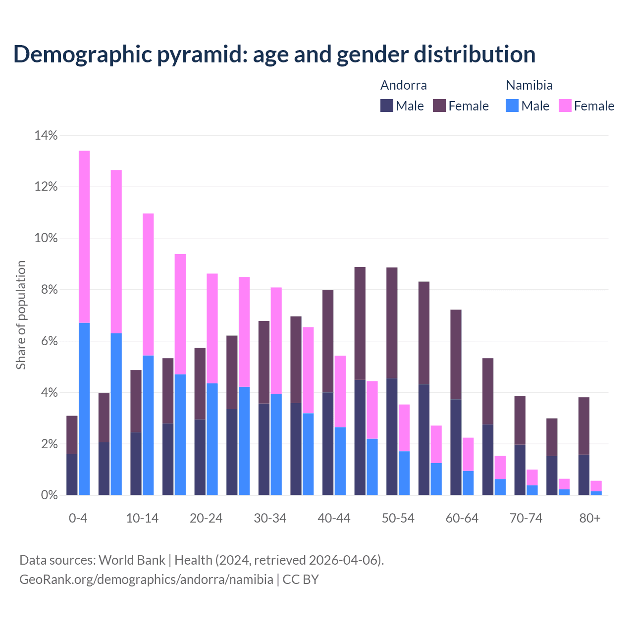 - Andorra is ranked 18/196 by median age (oldest to youngest) vs 147/196 for Namibia.