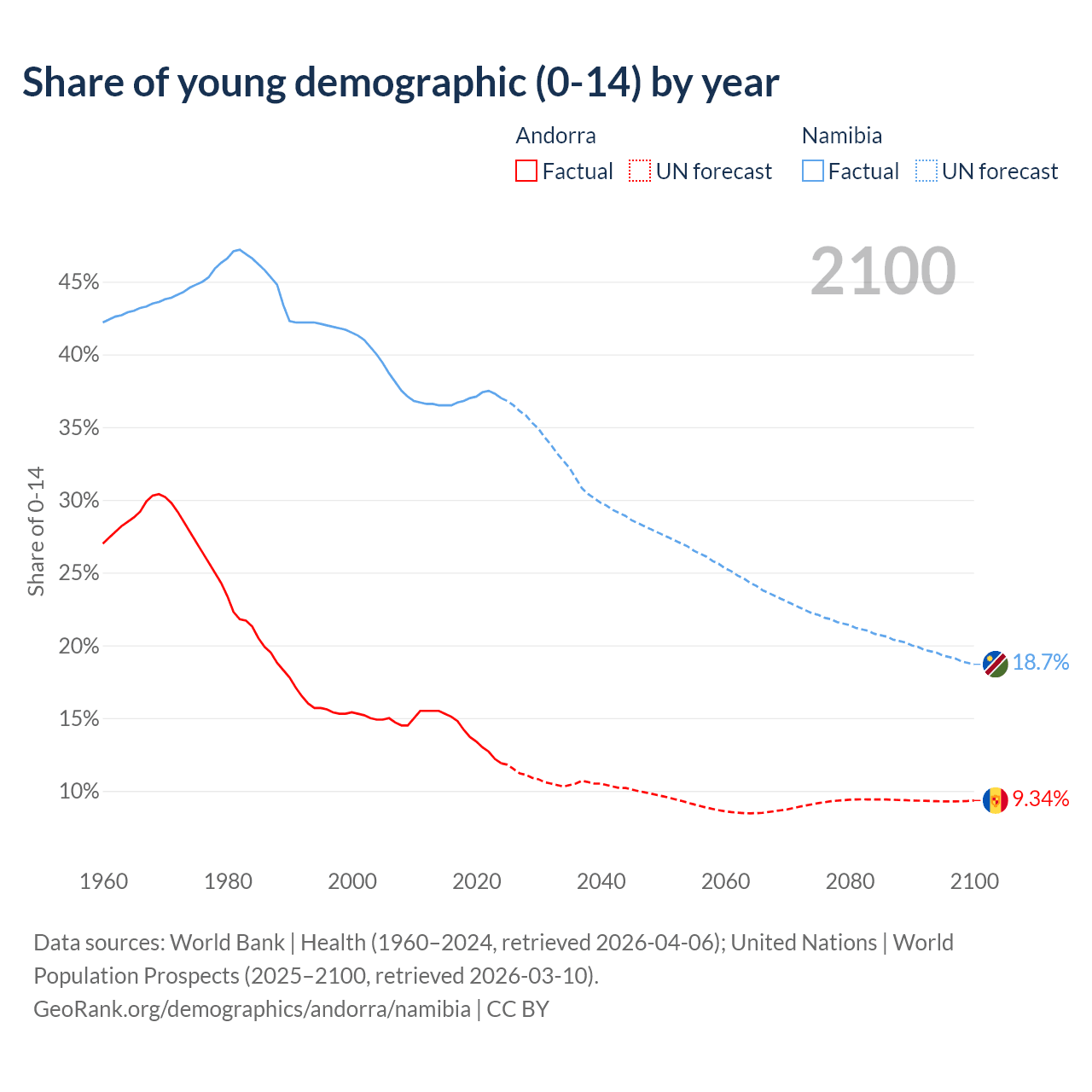- The share of young demographic (0-15 years old) in Andorra is 11.9% vs 37% in Namibia.