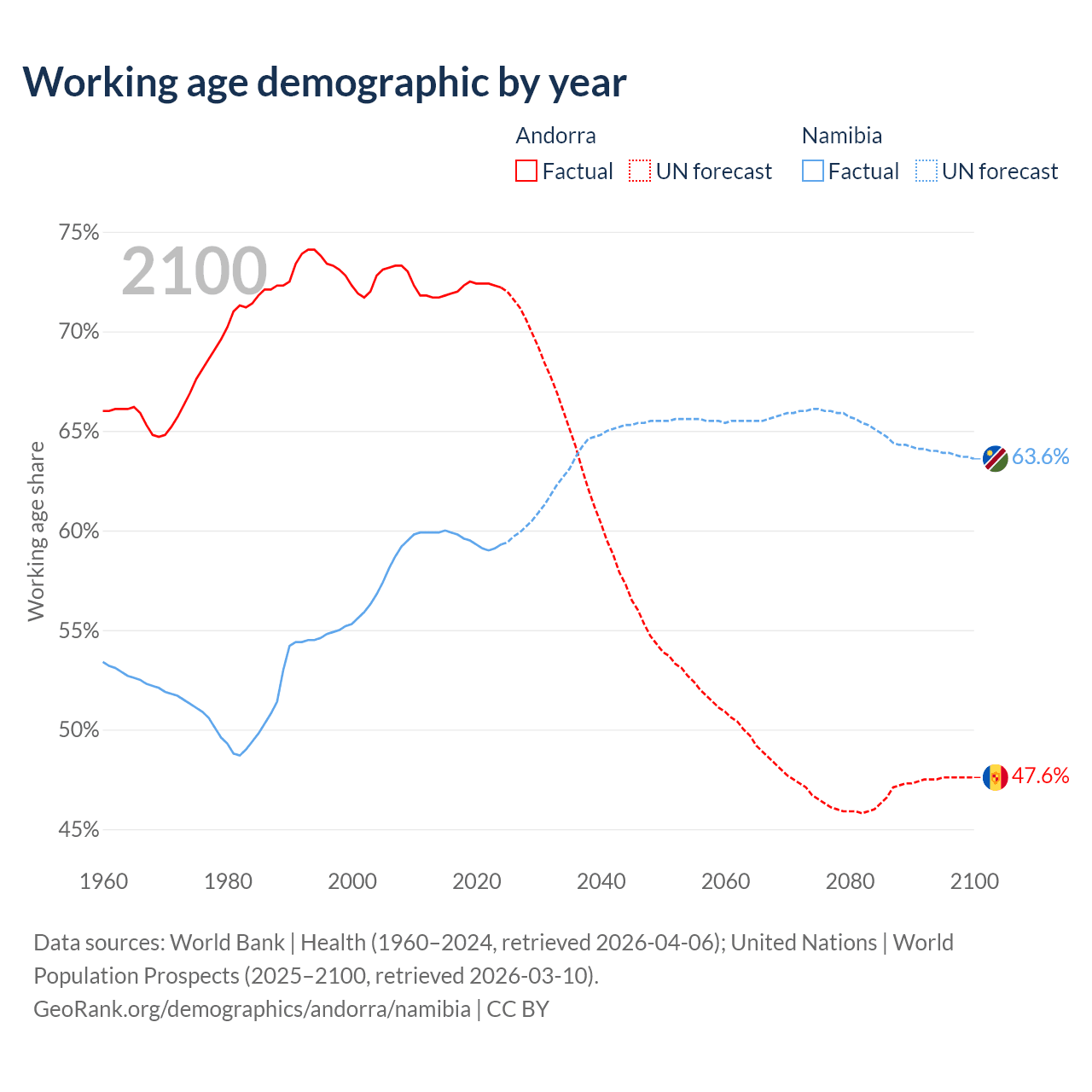 - Andorra has 60.7K working age adults (aged 15-64) vs 1.88M in Namibia.