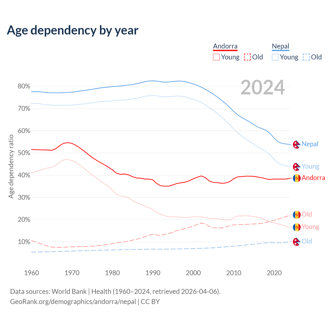 - Andorra is ranked 18/196 by median age (oldest to youngest) vs 127/196 for Nepal.