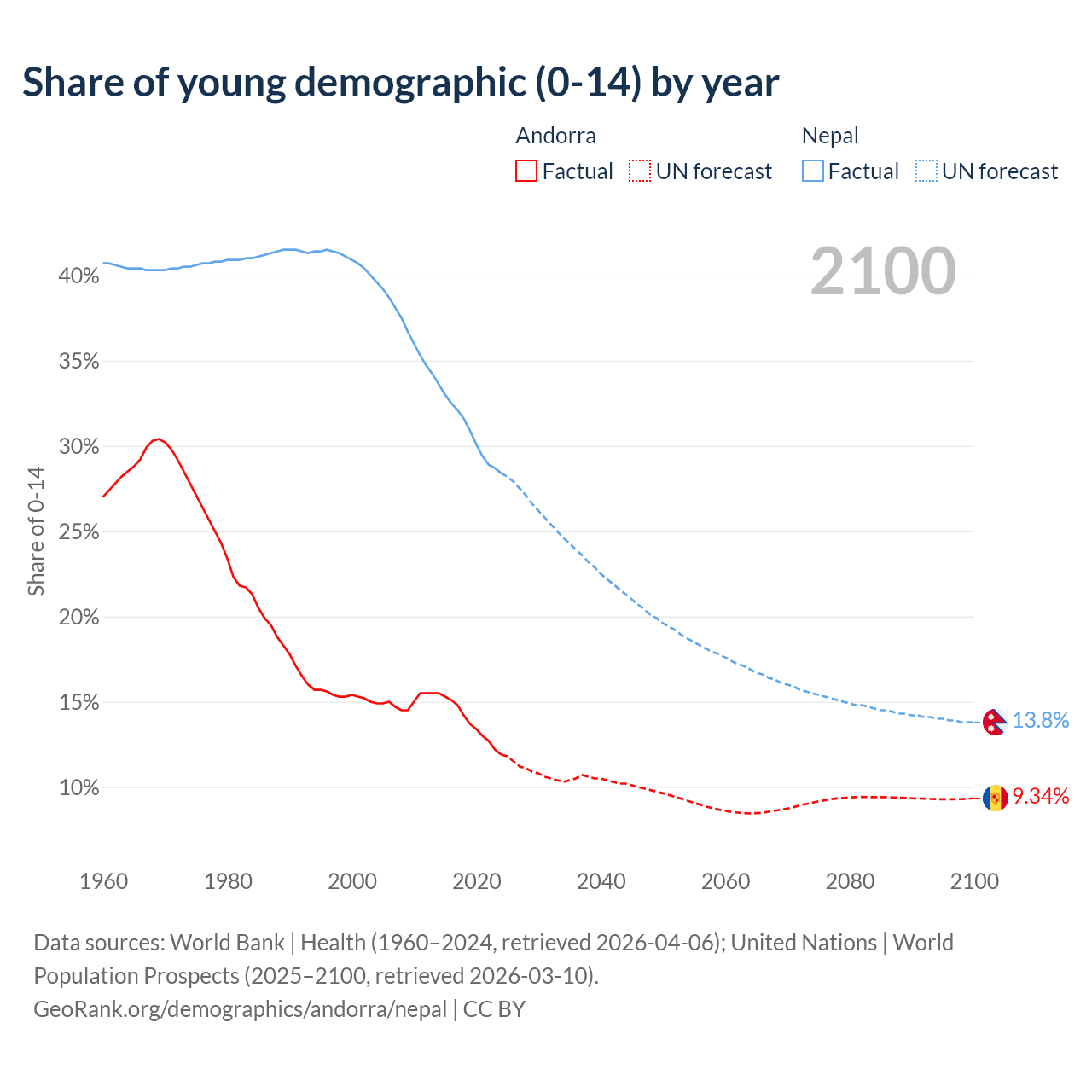 - The share of young demographic (0-15 years old) in Andorra is 11.9% vs 28.4% in Nepal.