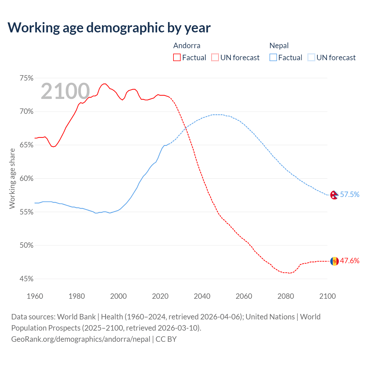 Median age Andorra vs Nepal, 1960-2100