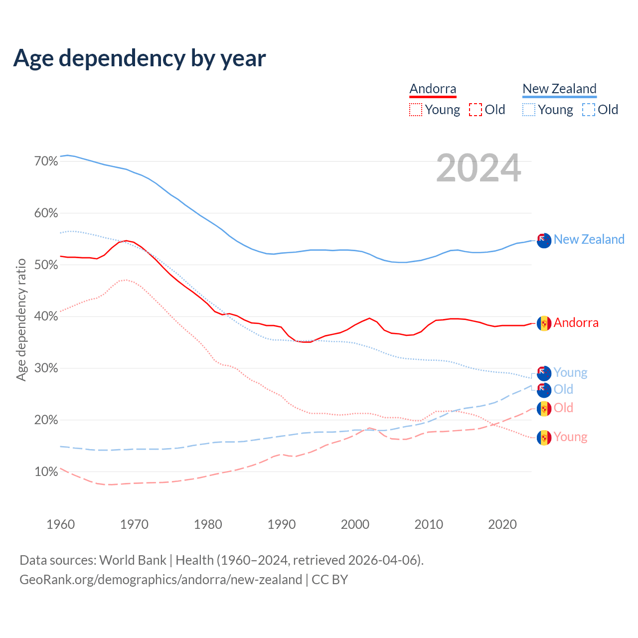 - Andorra is ranked 18/196 by median age (oldest to youngest) vs 56/196 for New Zealand.