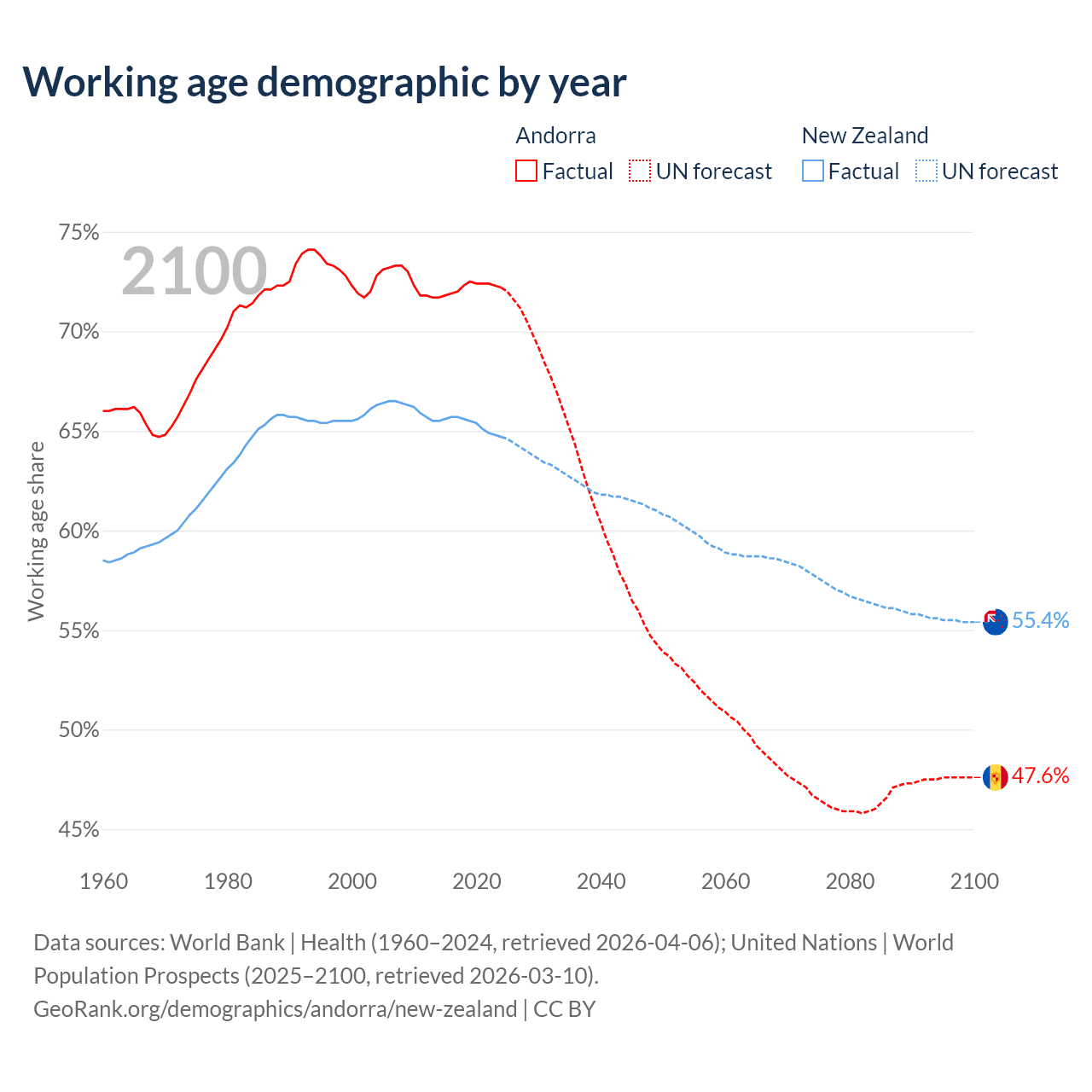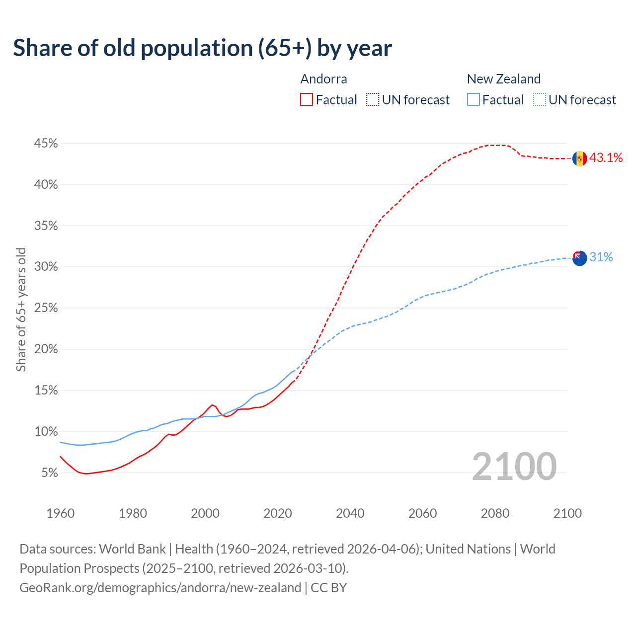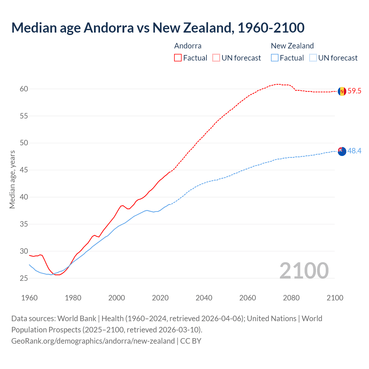 Median age Andorra vs New Zealand, 1960-2100