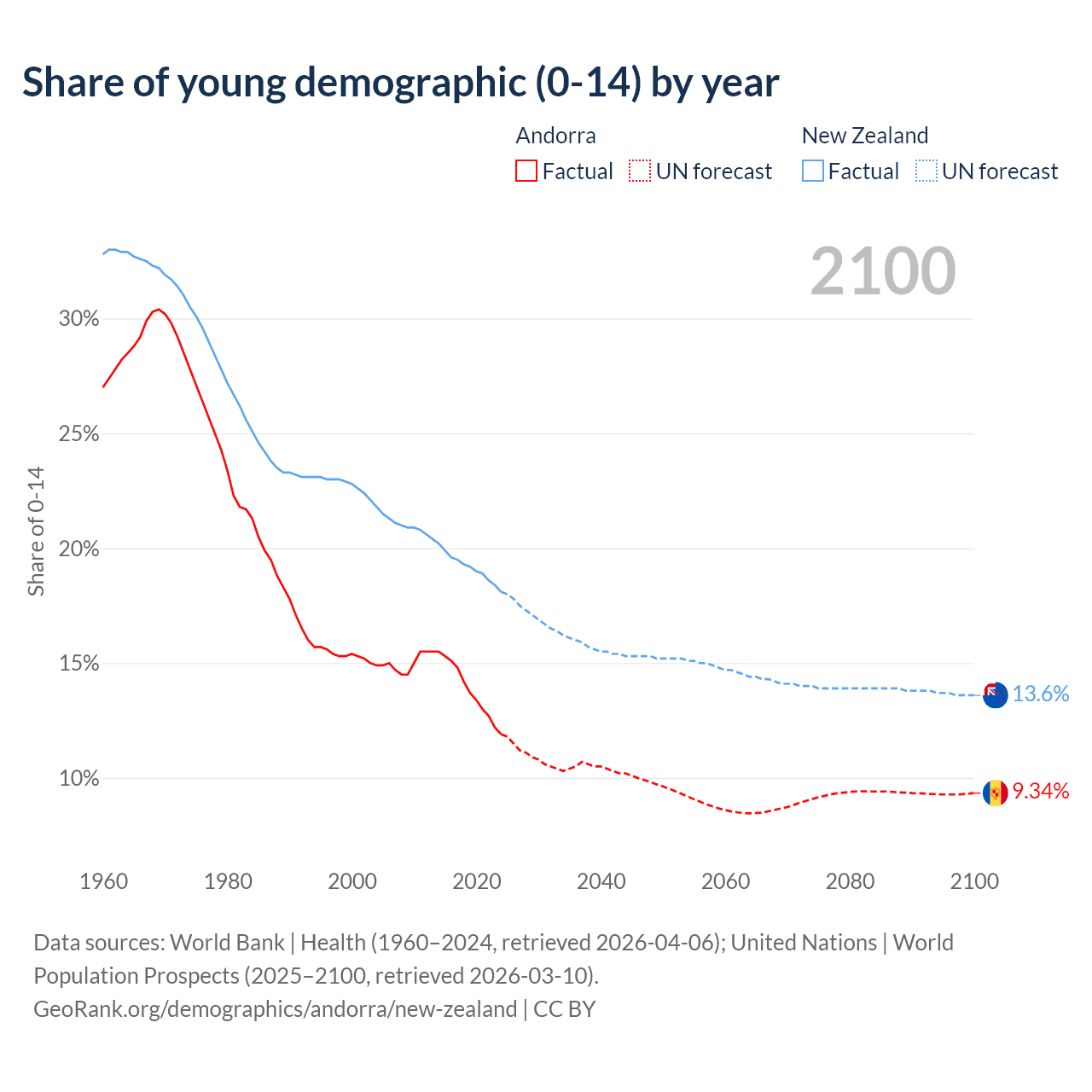 - The share of young demographic (0-15 years old) in Andorra is 11.9% vs 18.1% in New Zealand.