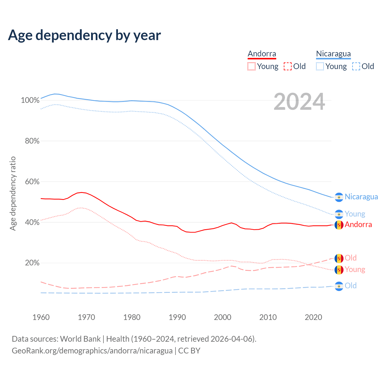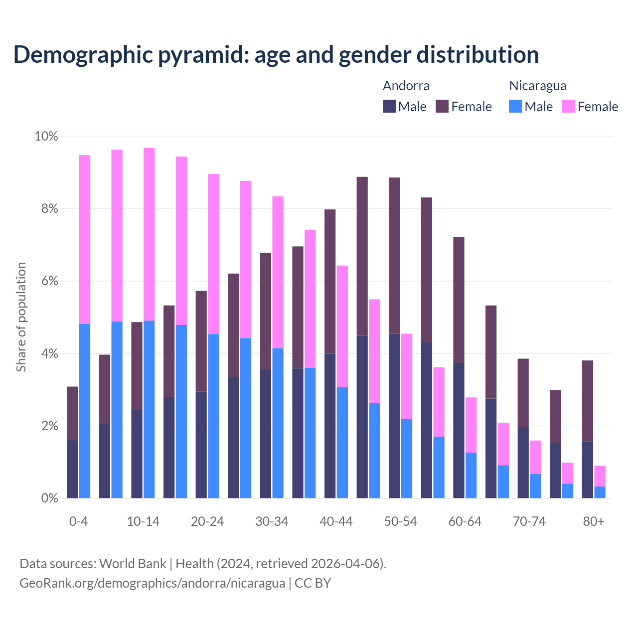 - The share of old-age demographic (65+) in Andorra is 15.9% vs 5.53% in Nicaragua.