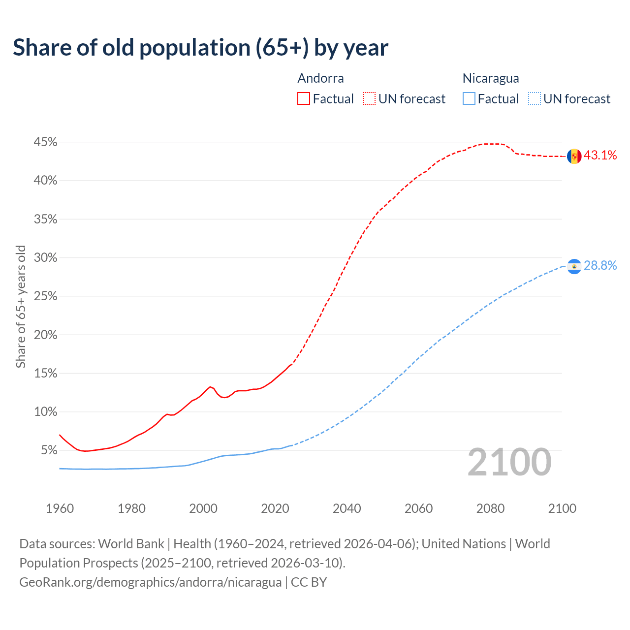 The share of older people aged 65 and over is 15.9% in Andorra and 5.53% in Nicaragua. Life expectancy in Andorra compared to Nicaragua .