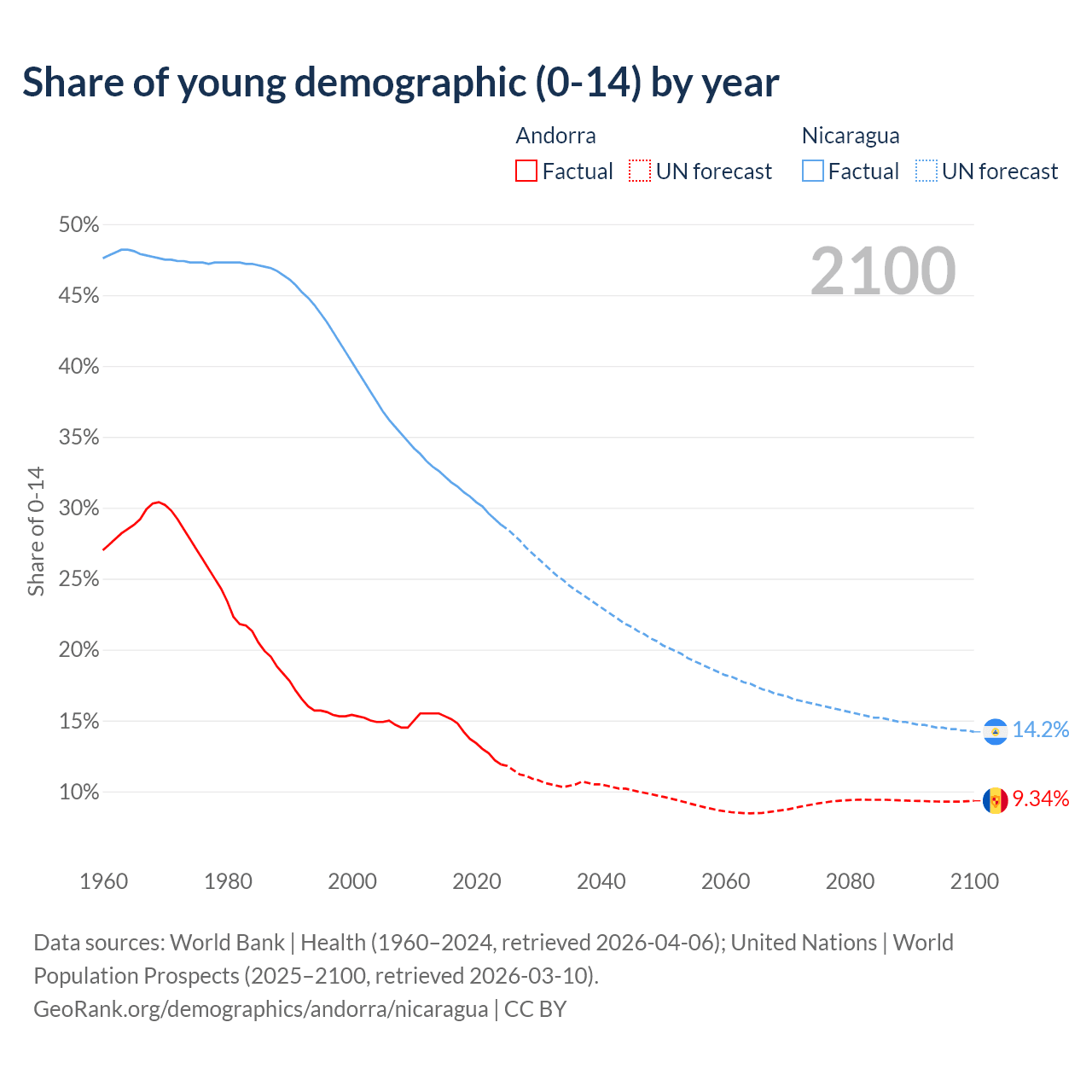 - The share of young demographic (0-15 years old) in Andorra is 11.9% vs 28.8% in Nicaragua.