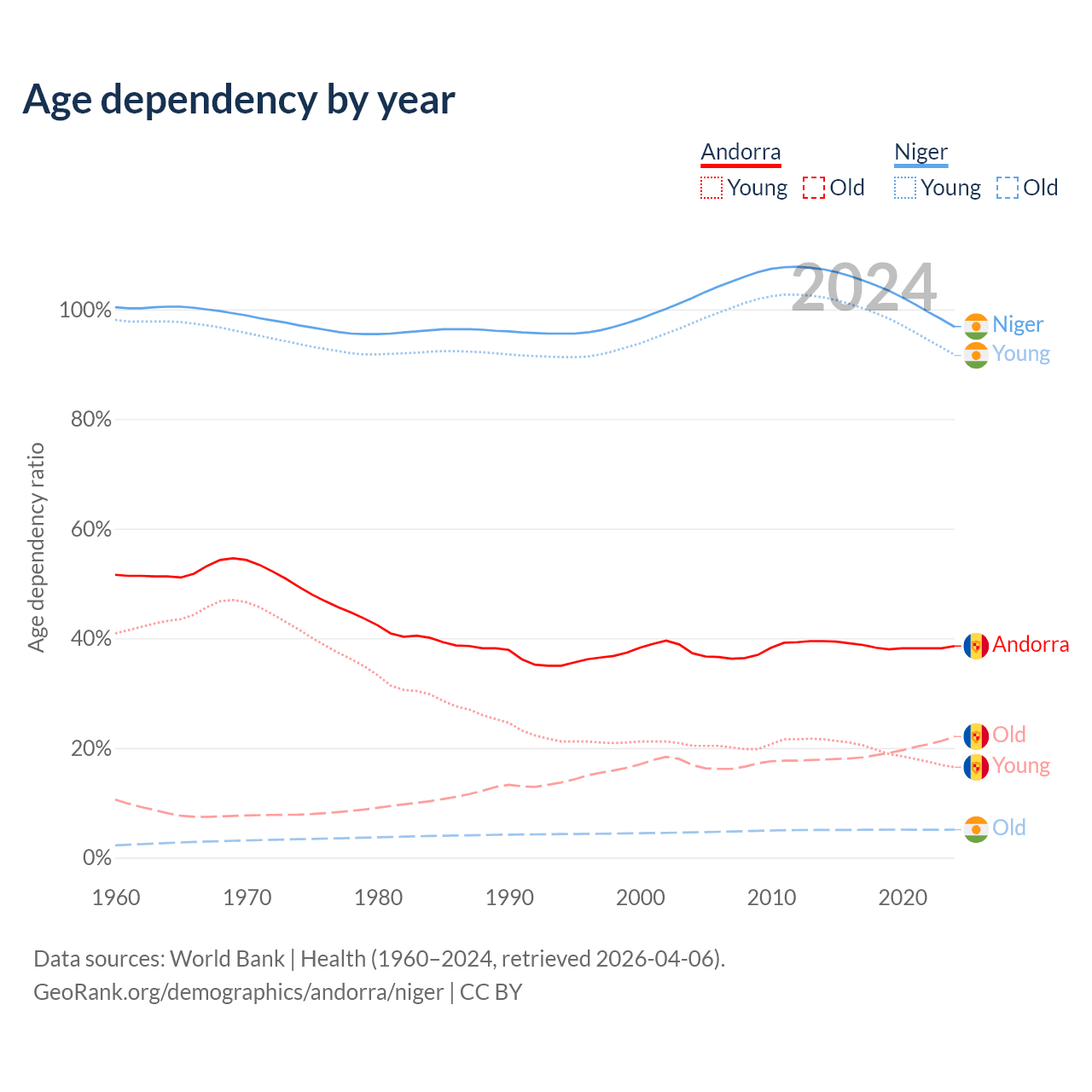 - The share of old-age demographic (65+) in Andorra is 15.9% vs 2.59% in Niger.