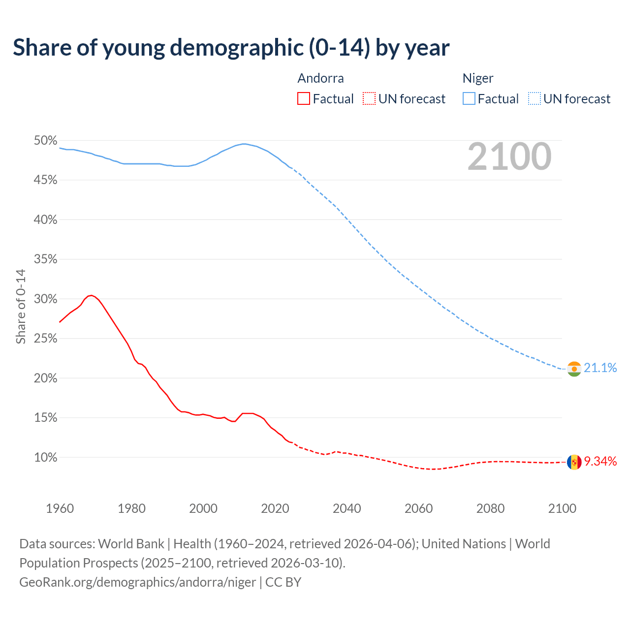 - The share of young demographic (0-15 years old) in Andorra is 11.9% vs 46.6% in Niger.