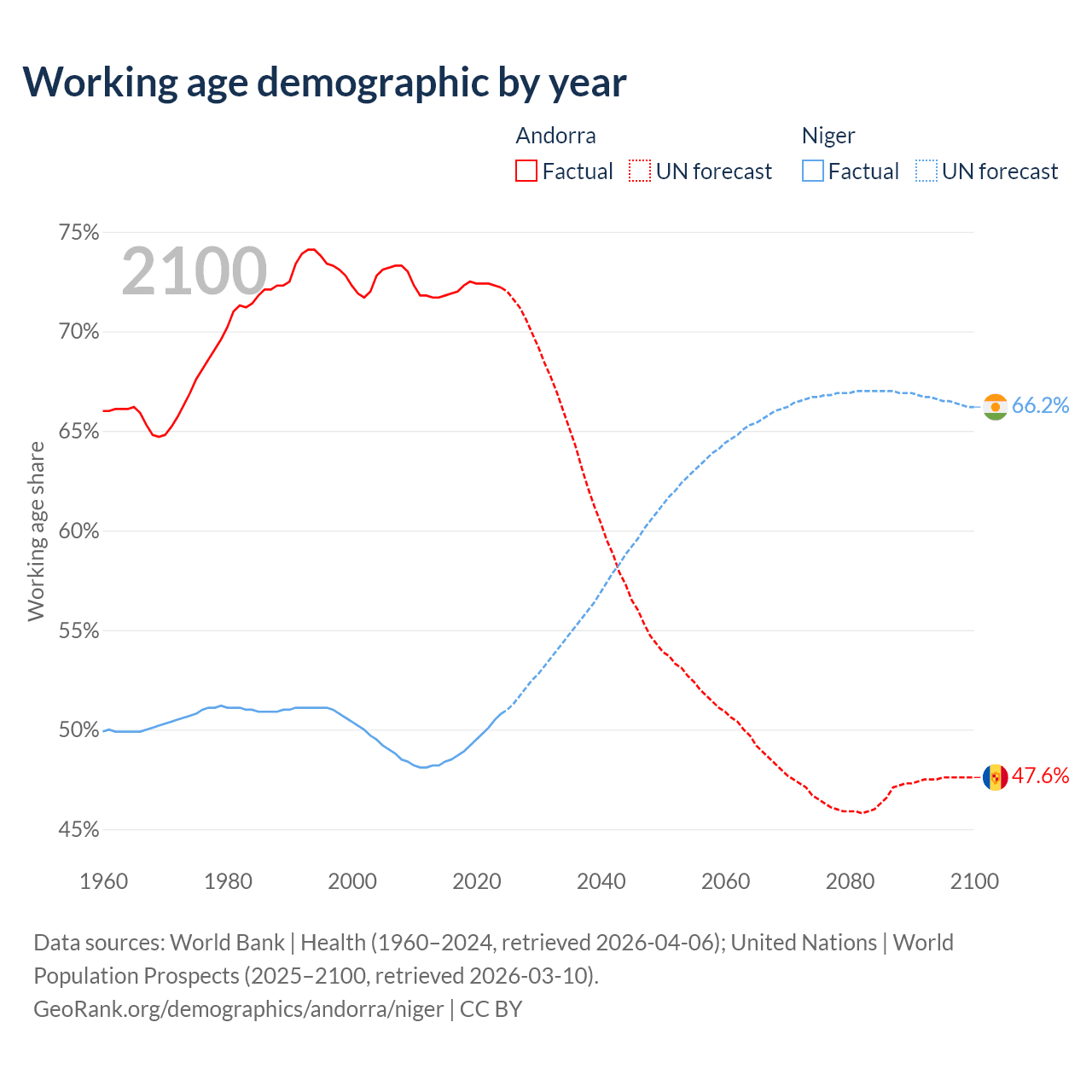 Median age Andorra vs Niger, 1960-2100