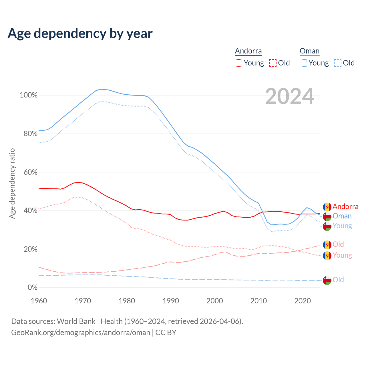 - Andorra is ranked 18/196 by median age (oldest to youngest) vs 101/196 for Oman.