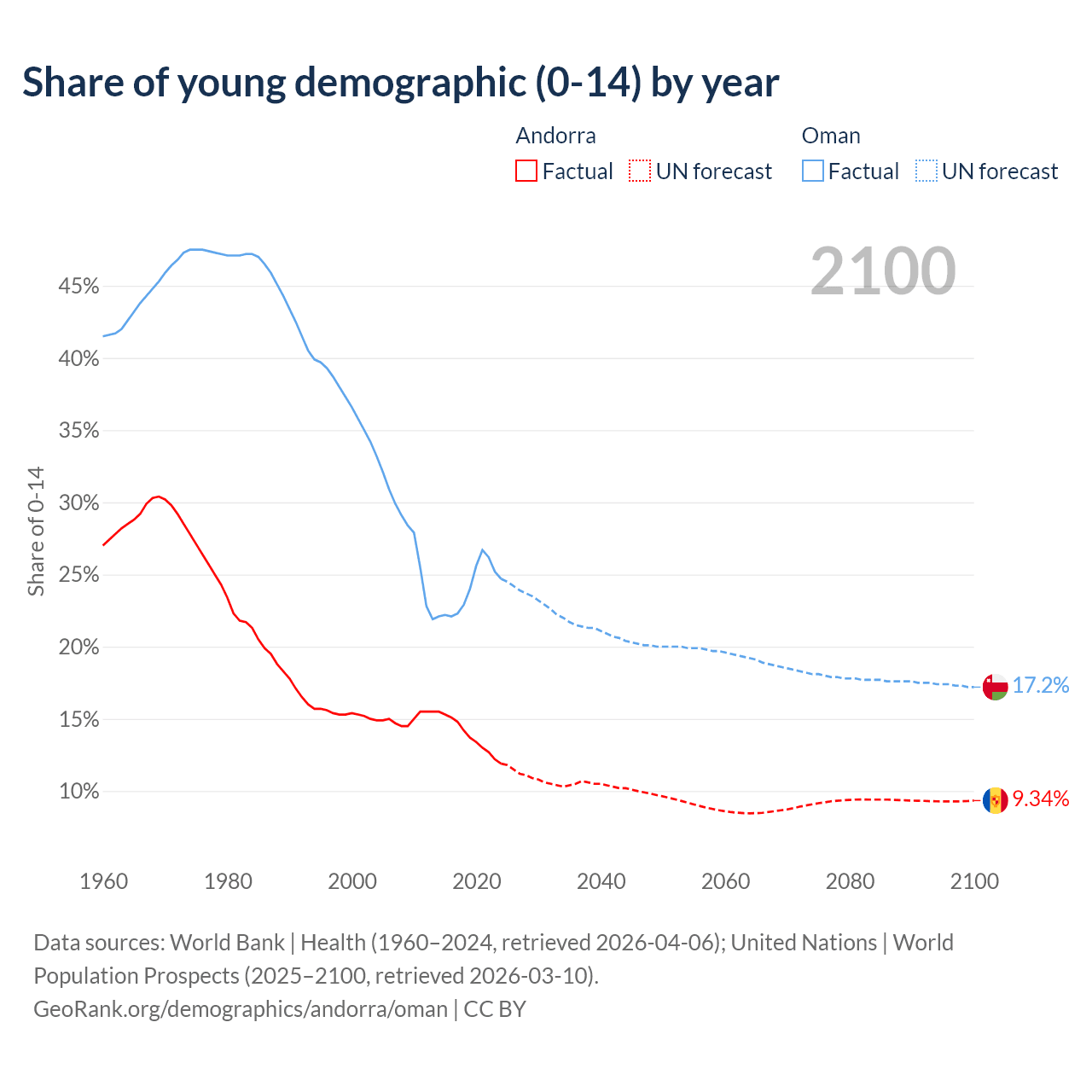 - The share of young demographic (0-15 years old) in Andorra is 11.9% vs 24.7% in Oman.
