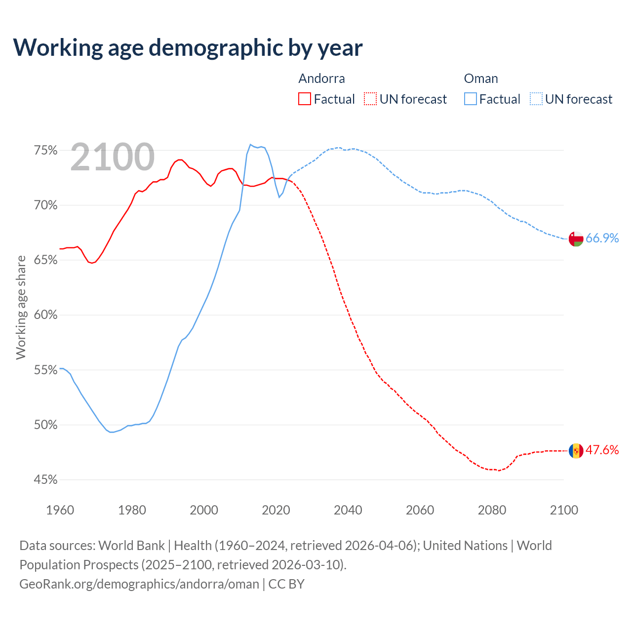 Median age Andorra vs Oman, 1960-2100