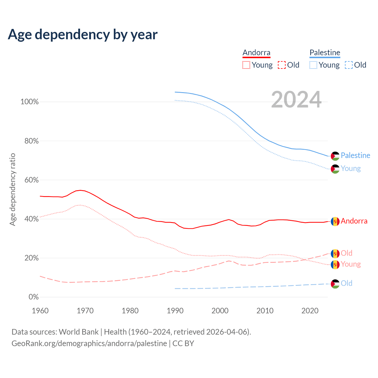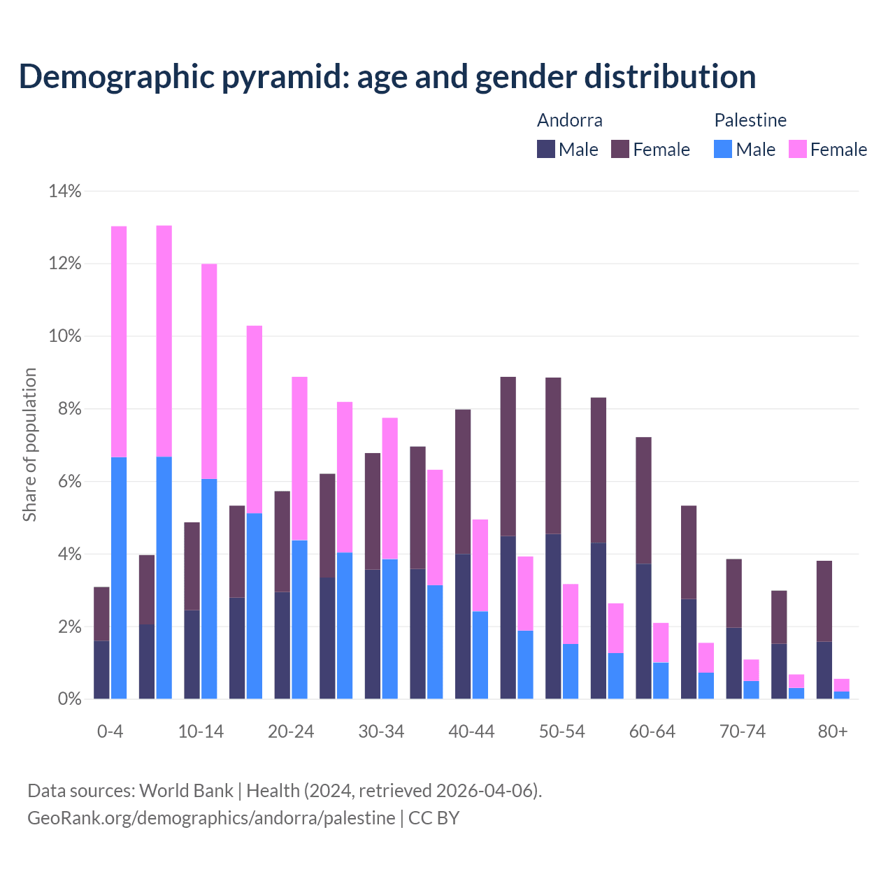 - The share of old-age demographic (65+) in Andorra is 15.9% vs 3.84% in Palestine.