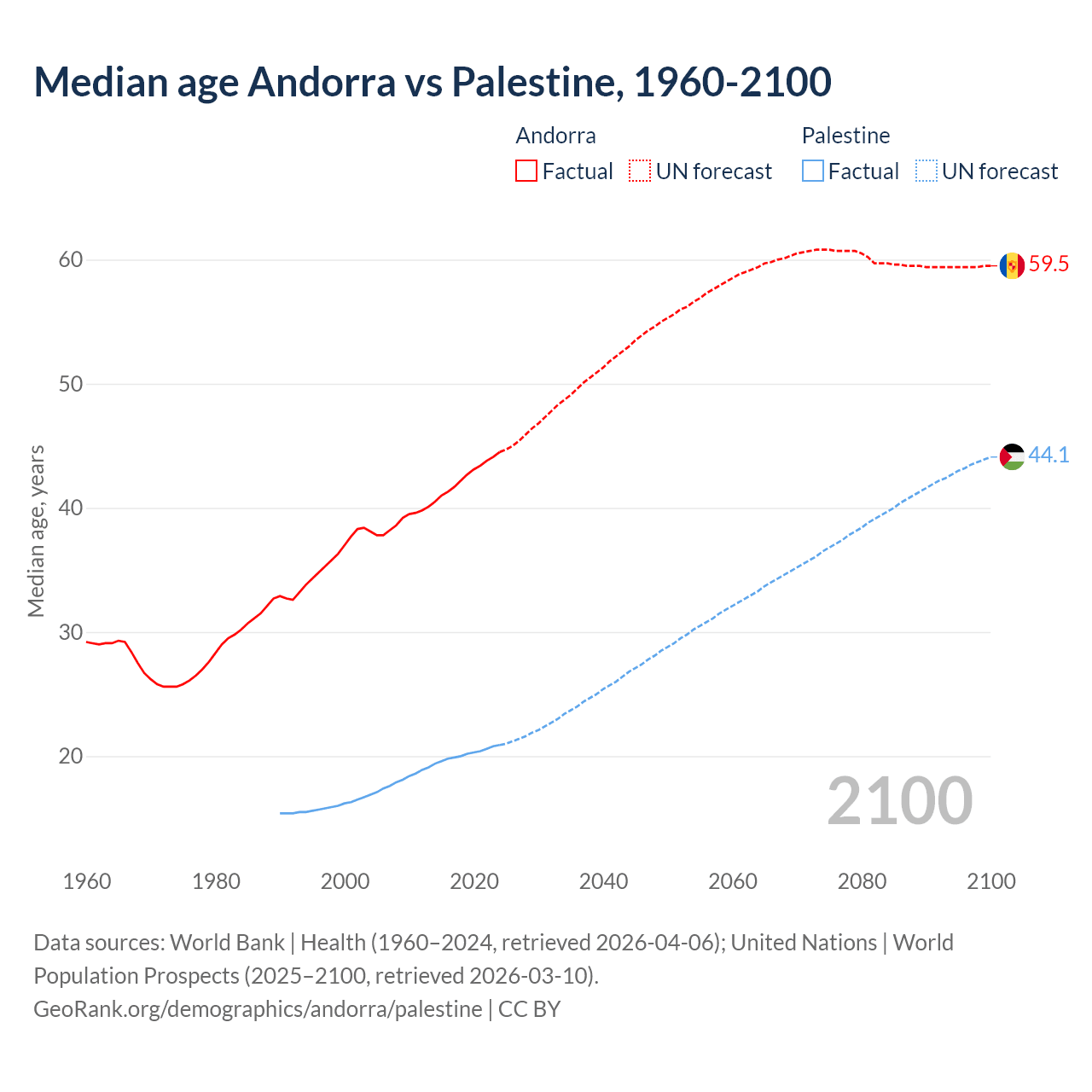 - Andorra is ranked 18/196 by median age (oldest to youngest) vs 157/196 for Palestine.