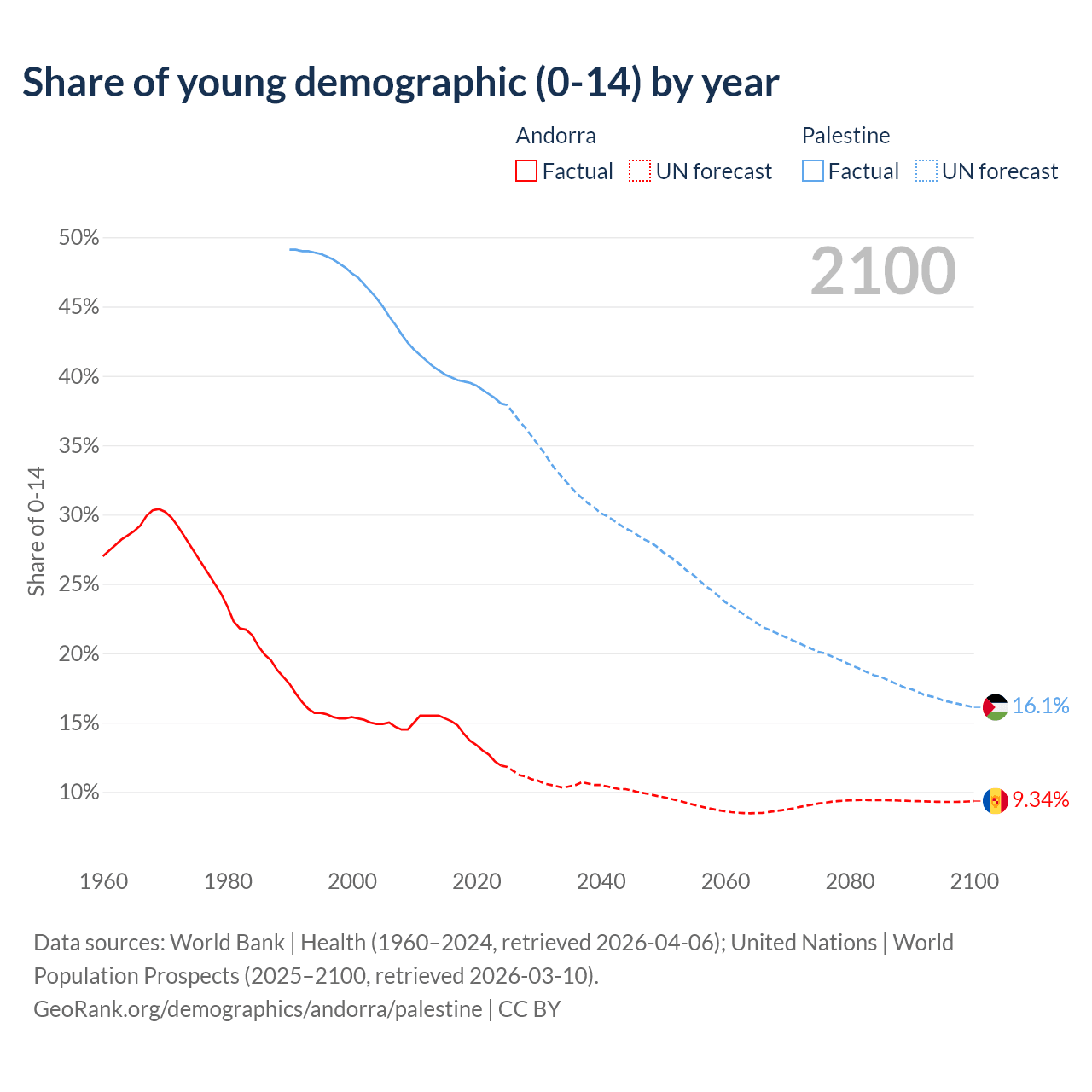 - The share of young demographic (0-15 years old) in Andorra is 11.9% vs 38% in Palestine.