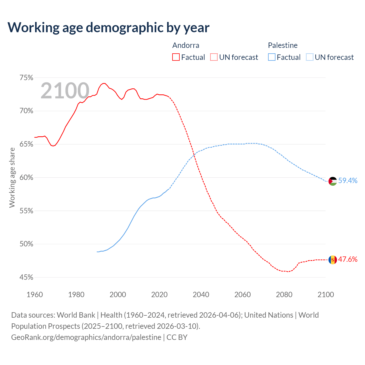 - Andorra has 60.7K working age adults (aged 15-64) vs 3.2M in Palestine.
