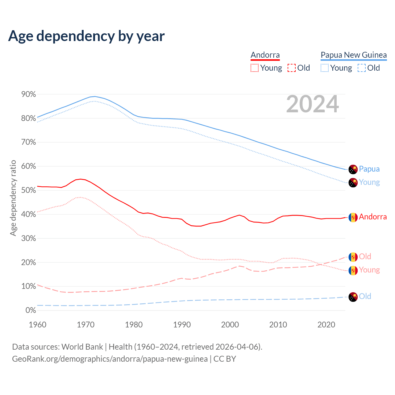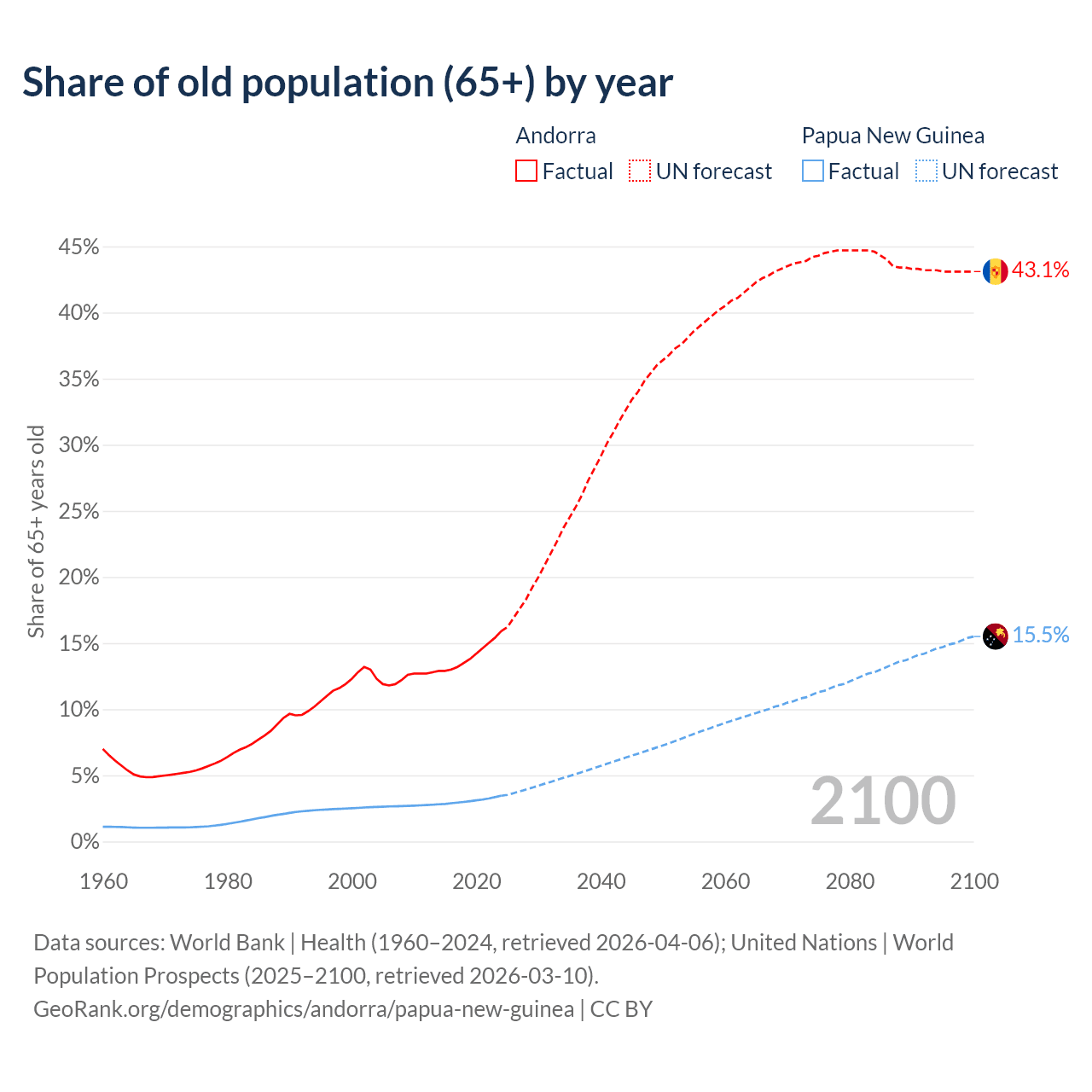 The share of older people aged 65 and over is 15.9% in Andorra and 3.46% in Papua New Guinea. Life expectancy in Andorra compared to Papua New Guinea .