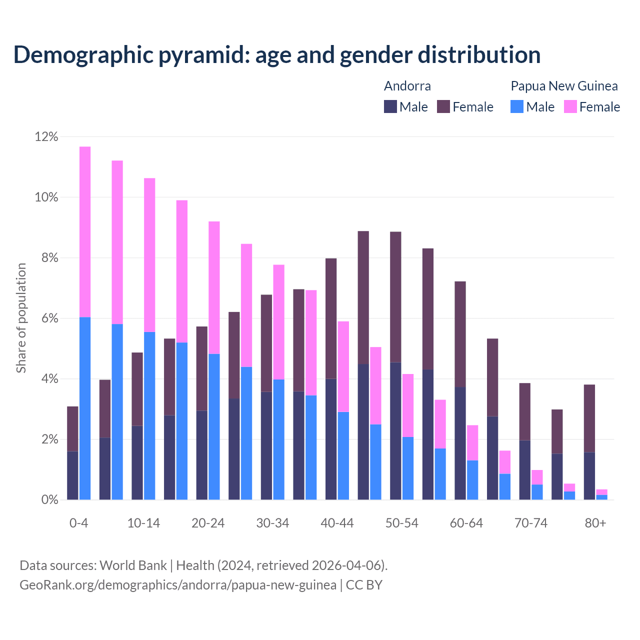 - As of 2026, the population of Andorra is 84.1K vs 11M in Papua New Guinea - 130.8 times difference.