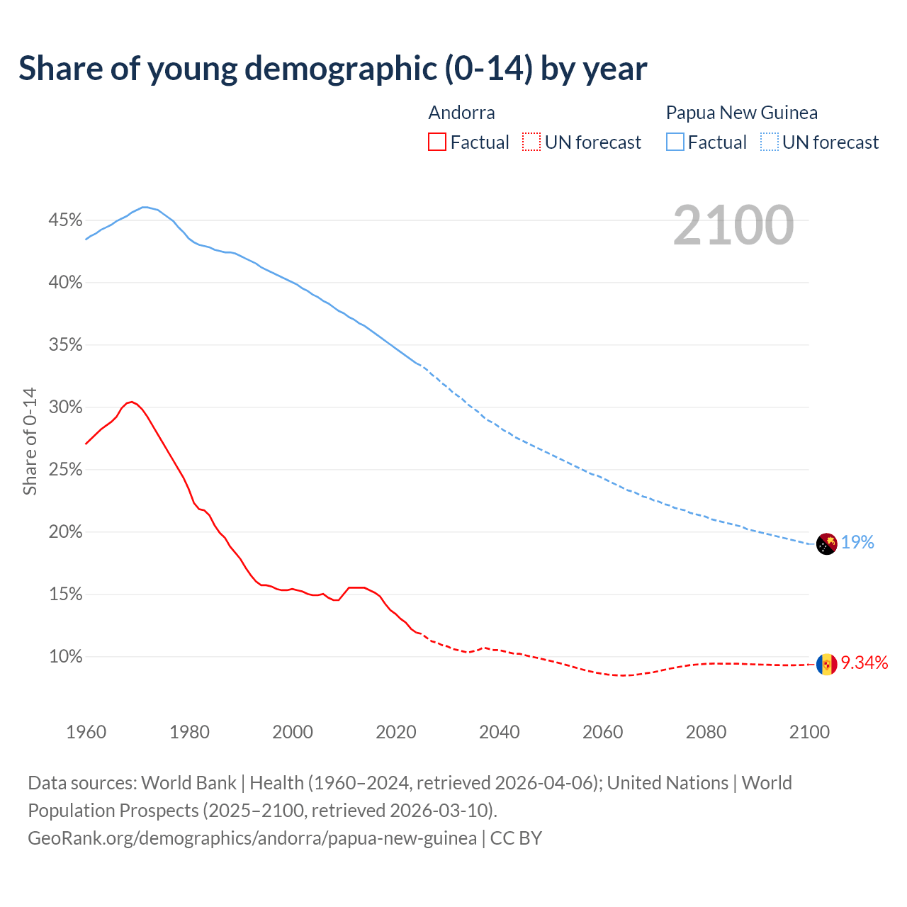- The share of young demographic (0-15 years old) in Andorra is 11.9% vs 33.5% in Papua New Guinea.