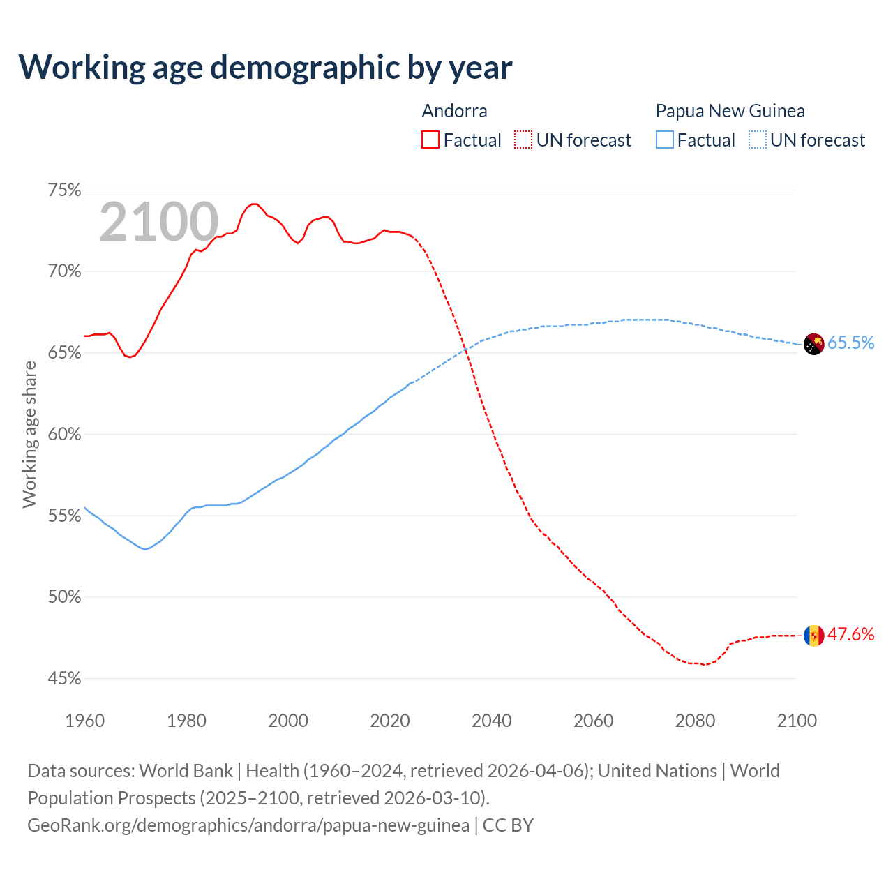 - Andorra has 60.7K working age adults (aged 15-64) vs 6.94M in Papua New Guinea.