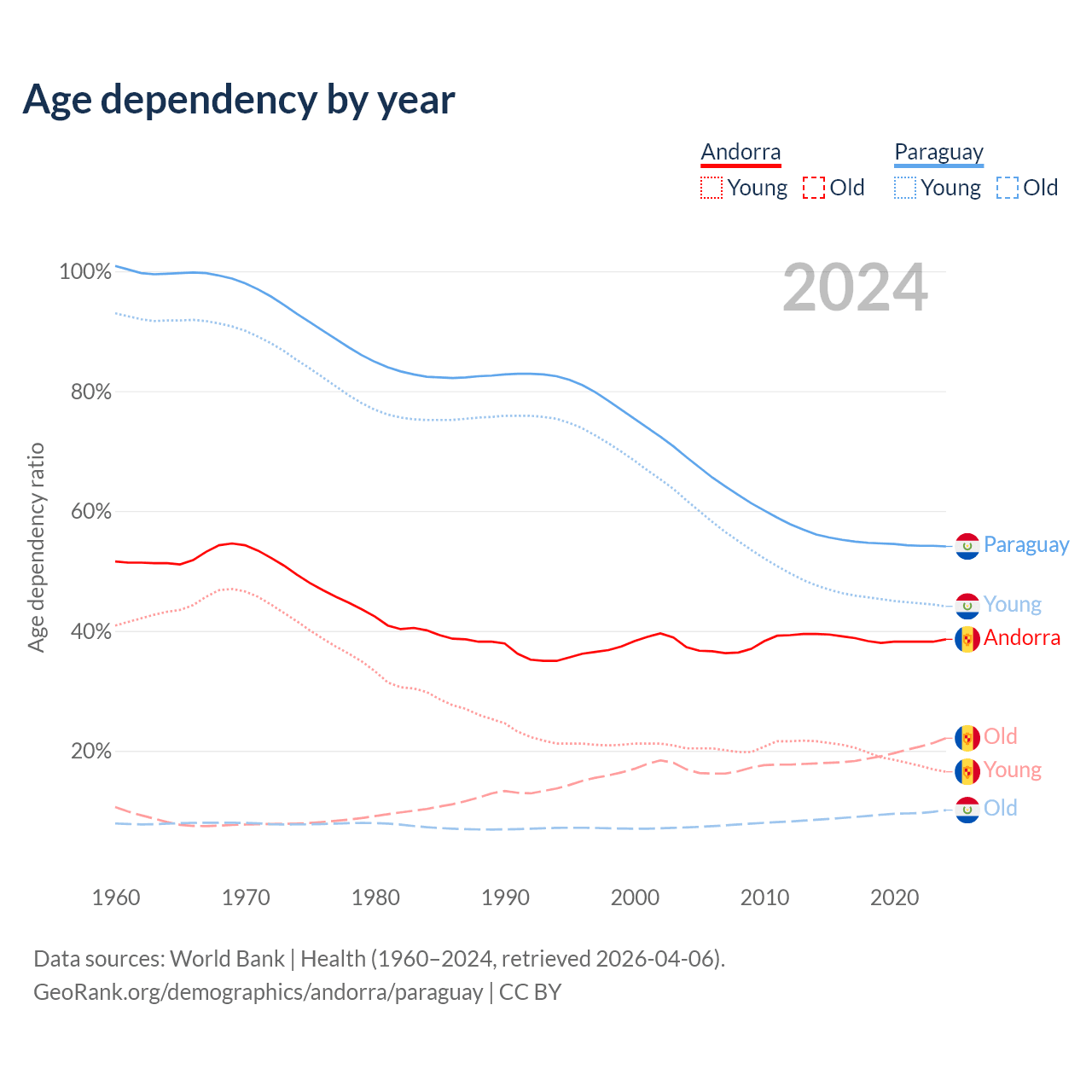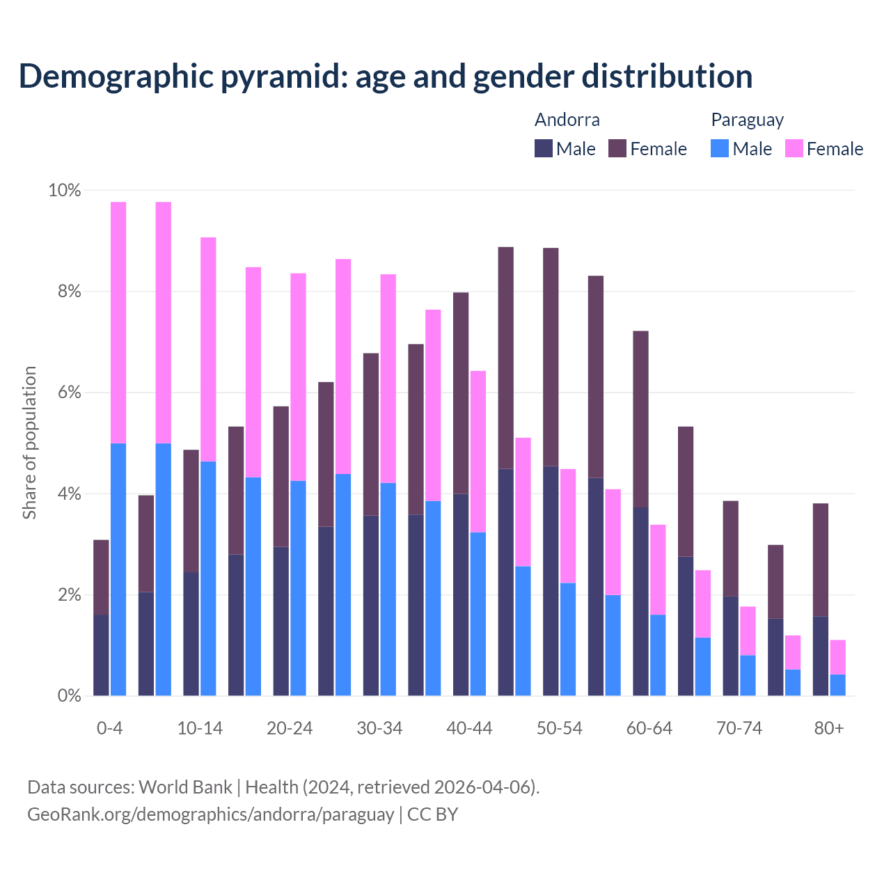 - The share of old-age demographic (65+) in Andorra is 15.9% vs 6.54% in Paraguay.