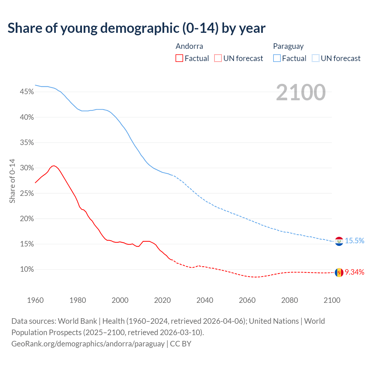 - The share of young demographic (0-15 years old) in Andorra is 11.9% vs 28.6% in Paraguay.