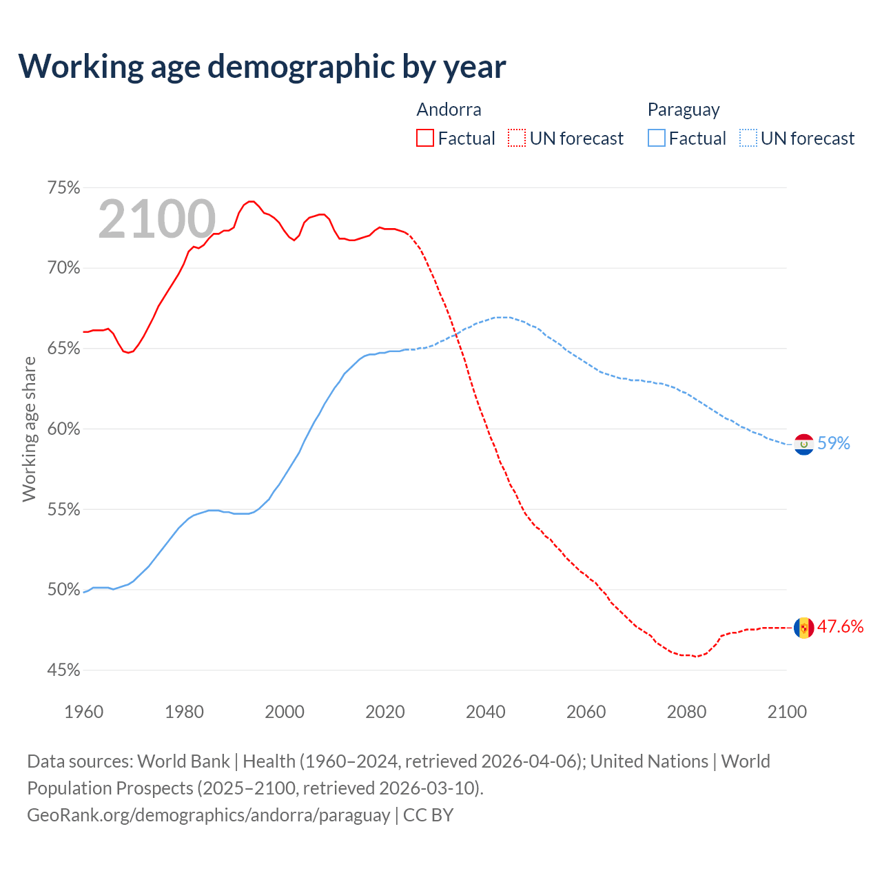 Median age Andorra vs Paraguay, 1960-2100