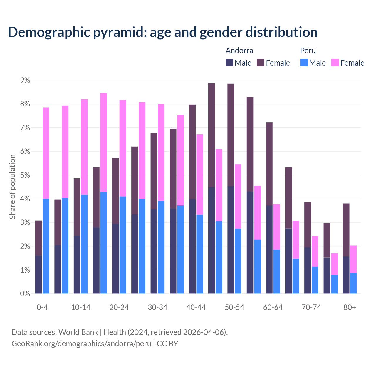 - As of 2026, the population of Andorra is 84.1K vs 35M in Peru - 417 times difference.