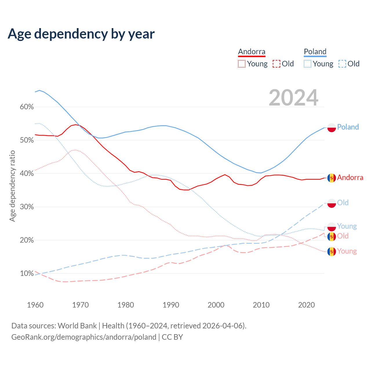 - Andorra is ranked 18/196 by median age (oldest to youngest) vs 30/196 for Poland.